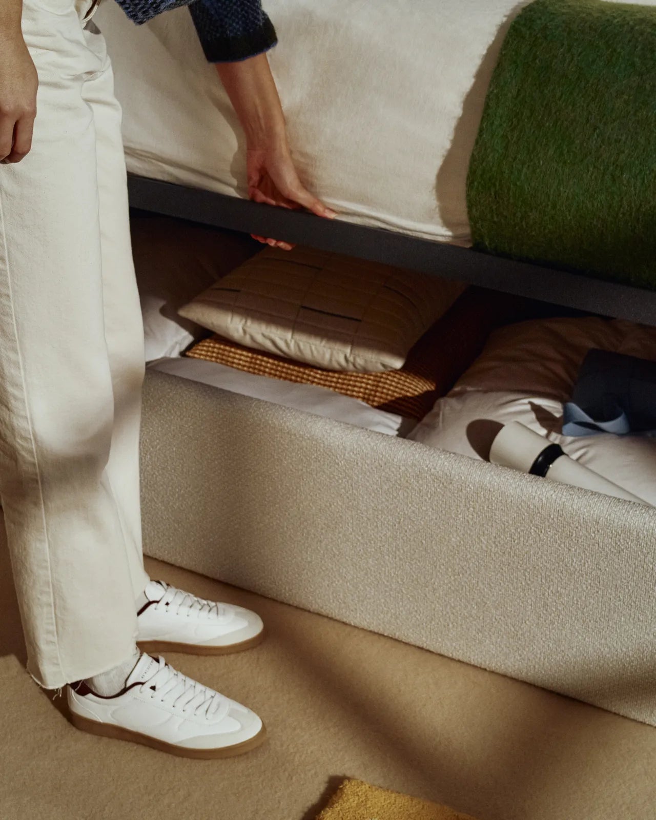 Das abziehbare, aufklappbare Bett mit Stauraum Nelzi vereint Design und Funktionalität in einem Möbelstück, das optimale Raumnutzung mit gepflegter Optik verbindet. Es verfügt über einen Öffnungsmechanismus mit Gasdruckfedern und einen übersichtlichen Innenraum ohne Trennwände, der mehr Stauraum bietet und eine einfachere Organisation ermöglicht. Der Bezug aus kleinstrukturierter Chenille fühlt sich weich und angenehm an. Der strapazierfähige Stoff mit schmutzabweisender Behandlung lässt sich leicht von Haaren befreien, wodurch er leicht zu pflegen ist und über lange Zeit in einwandfreiem Zustand gehalten werden kann. Der Lattenrost besteht aus hochflexiblen Pappelsperrholzlatten, die an geräusch- und stoßdämpfenden Polyethylenhalterungen befestigt sind. Nelzi wird aus 100 % FSC™-zertifiziertem Holz und Stoff von einem nach OEKO-TEX® STANDARD 100 zertifizierten Lieferanten hergestellt, was eine unbedenkliche und verantwortungsvolle Produktion gewährleistet. Das in Europa hergestellte Produkt spiegelt unser Engagement für Qualität, Langlebigkeit und Nachhaltigkeit wider.