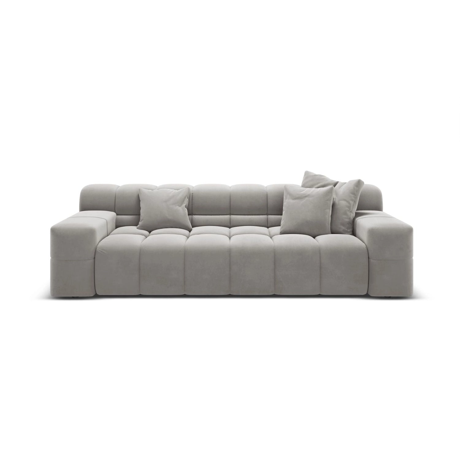 Das Sofa bietet eine ausgewogene Kombination aus Komfort und formaler Schlichtheit. Die gepolsterte Rückenlehne und die großzügige Sitzfläche laden zum Verweilen ein, ohne den Raum zu überladen. Der silberne Samt passt zu zurückhaltenden wie auch kontrastreichen Einrichtungsstilen.