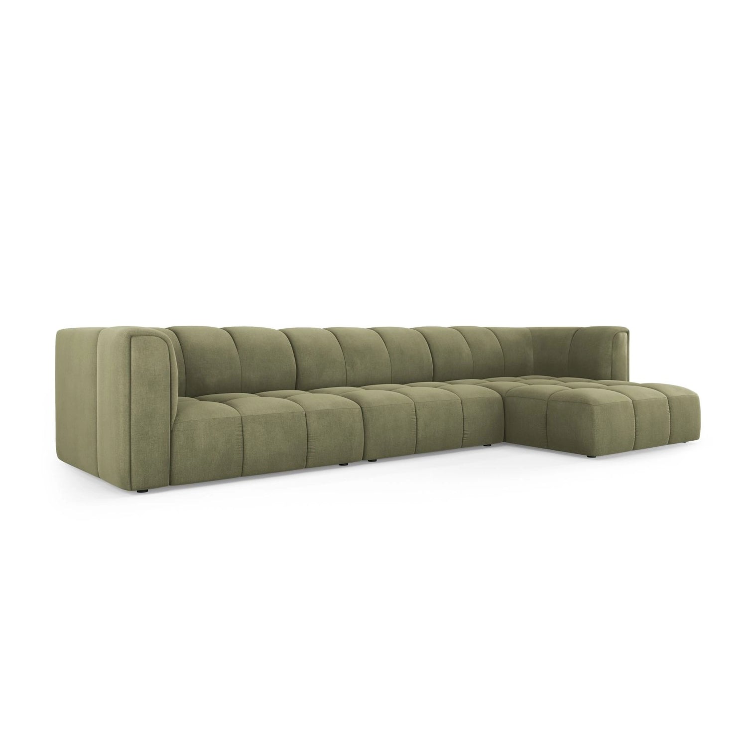 Moritz 5-Sitzer Ecksofa, Rechte Seite, aus Samt oder Chenille, 316x160x70 cm - Chenille (Rebel 25), Beige // Beine Schwarzes Plastik ist auf Lager und wird versandt, sobald es wieder verfügbar ist