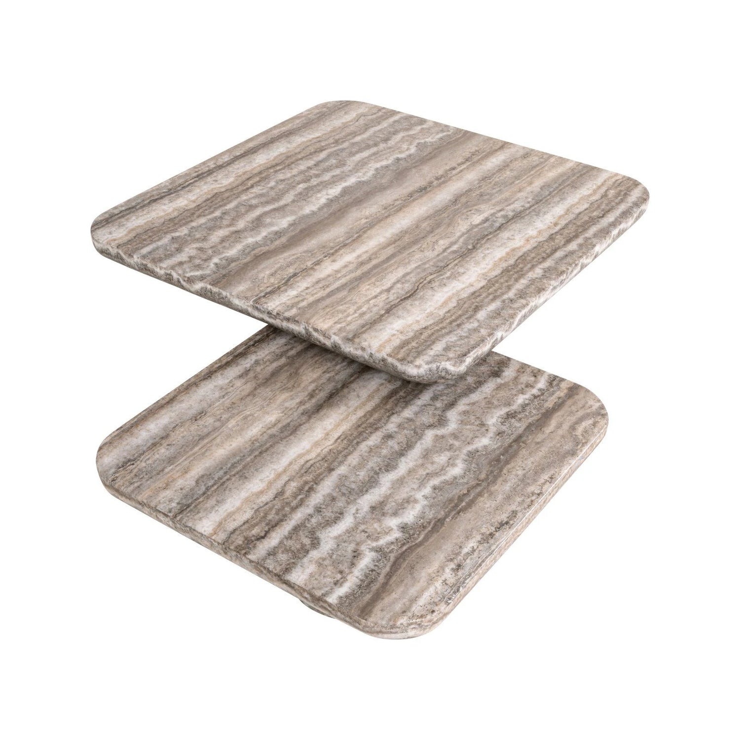 Couchtisch Denizly besteht aus einem Set von zwei passenden Tischen mit abgerundeten Kanten und grauer Faux-Travertin-Oberfläche. Perfekt für gestufte Arrangements im Wohnzimmer.