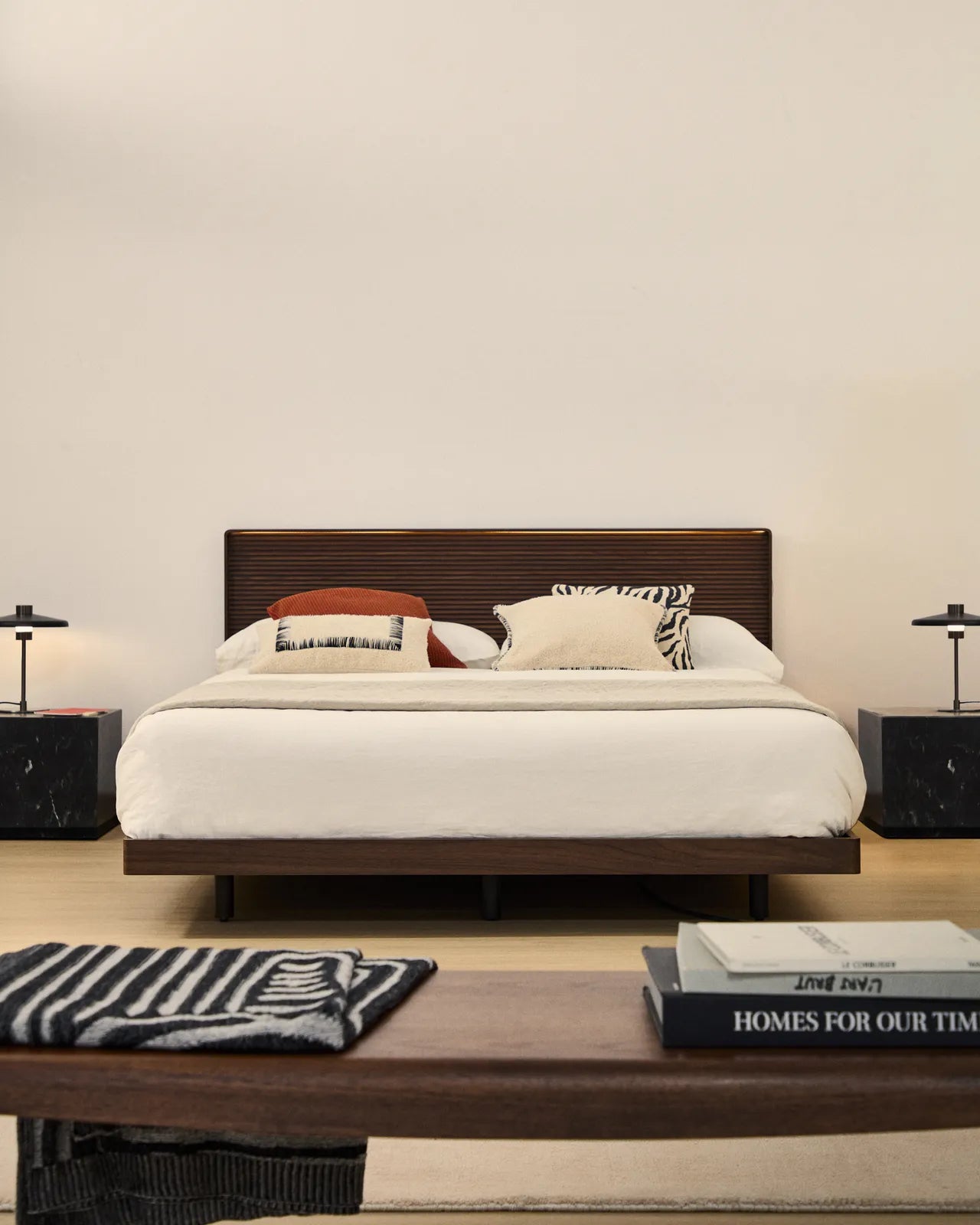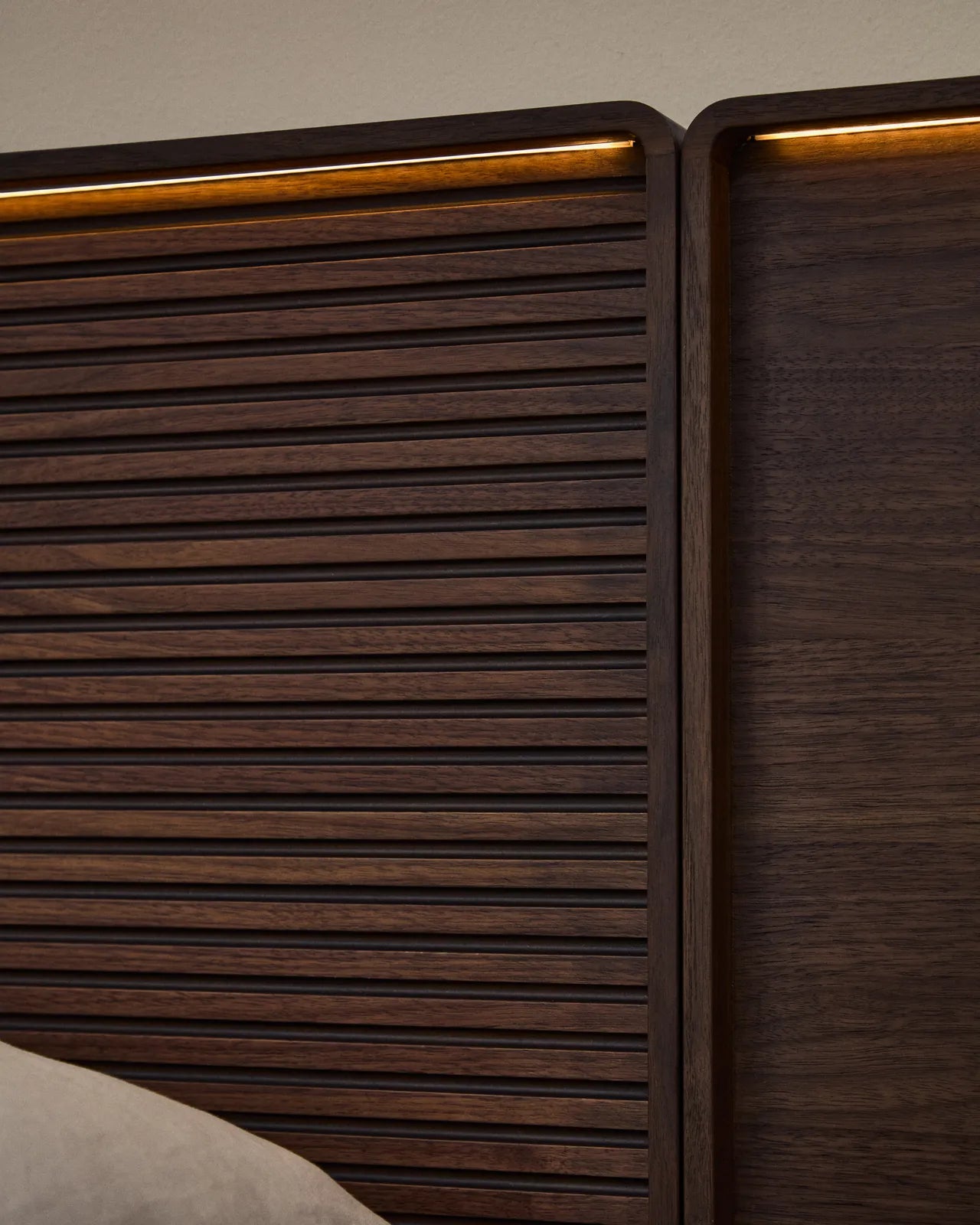 Bett Norlen aus Nussbaumfurnier mit dunklem Finish und LED-Licht für Matratzen 180 x 200 cm FSC Mix Credit ist auf Lager und wird versandt, sobald es wieder verfügbar ist