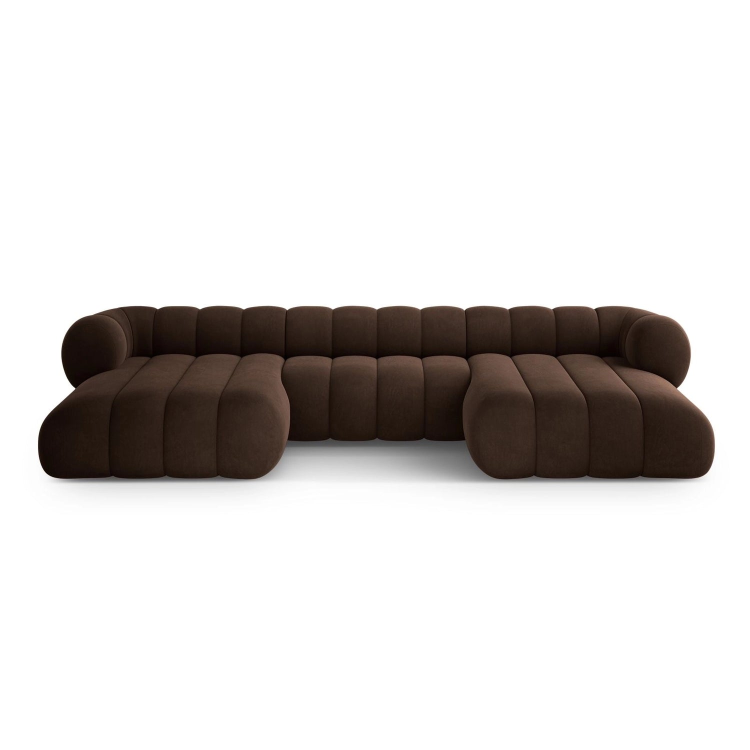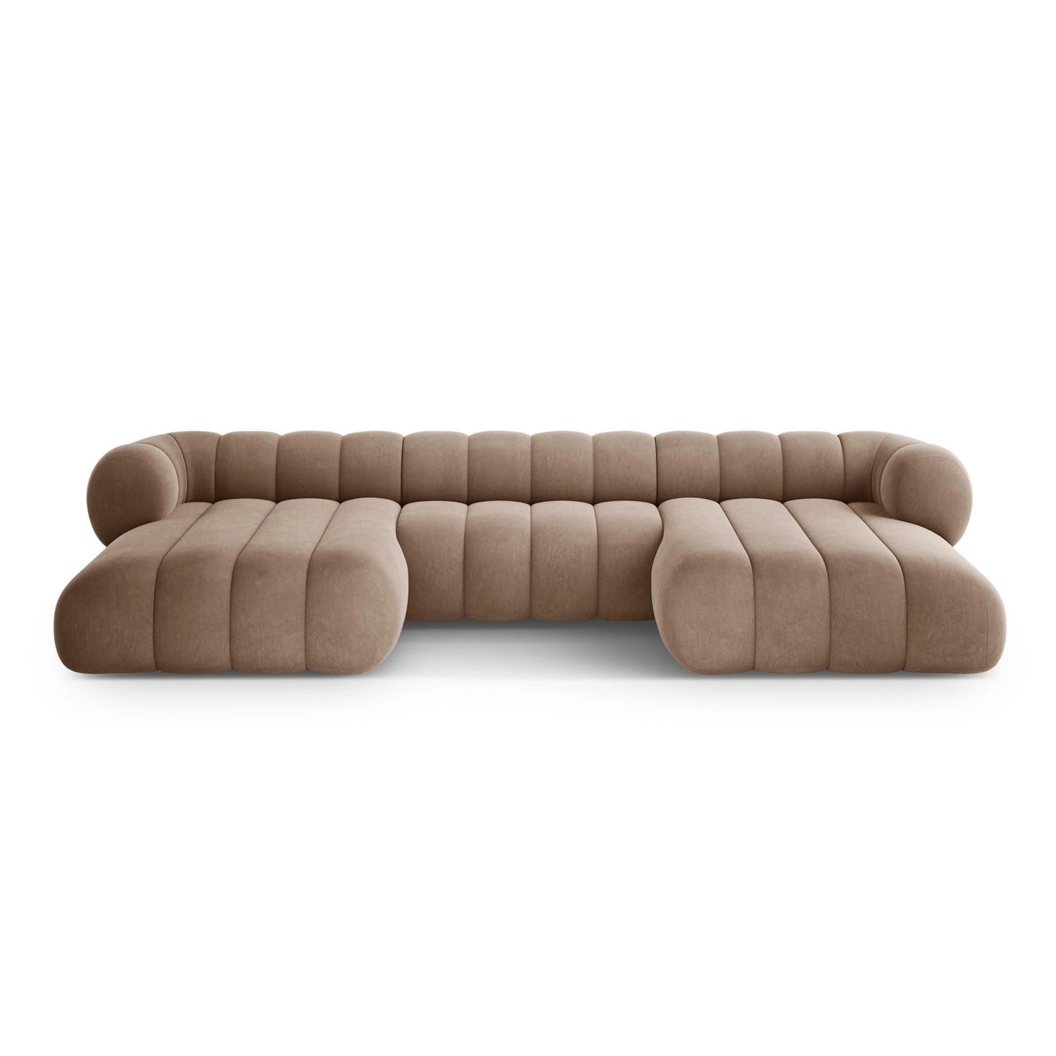 Das Koge 6-Sitzer Panorama Sofa präsentiert sich in einem hellbeigen Samtbezug der Stoffkollektion Vogue 1 und bietet großzügigen Sitzkomfort für bis zu sechs Personen.