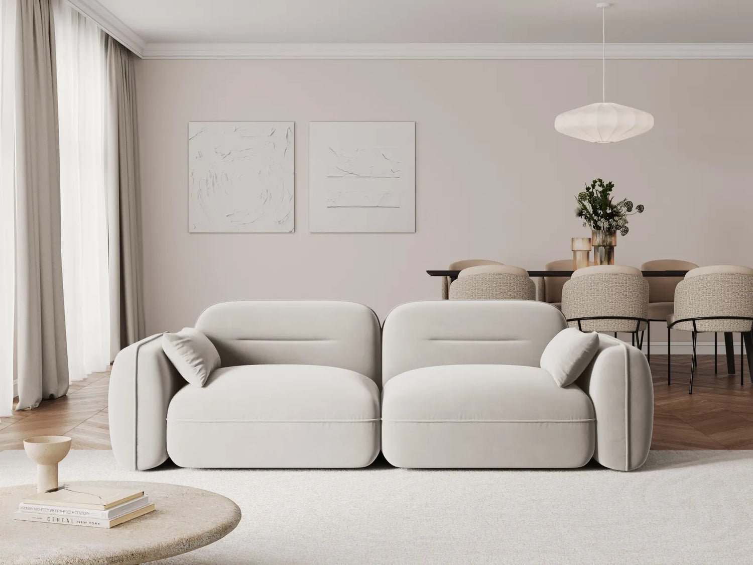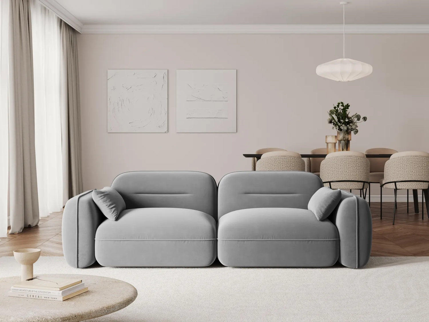 Das Design ist klar und modern, passend für urbane Wohnräume mit einem Fokus auf Komfort und Stil. Die hellgraue Farbe und der samtige Stoff verleihen dem Möbelstück eine edle und zugleich gemütliche Ausstrahlung.