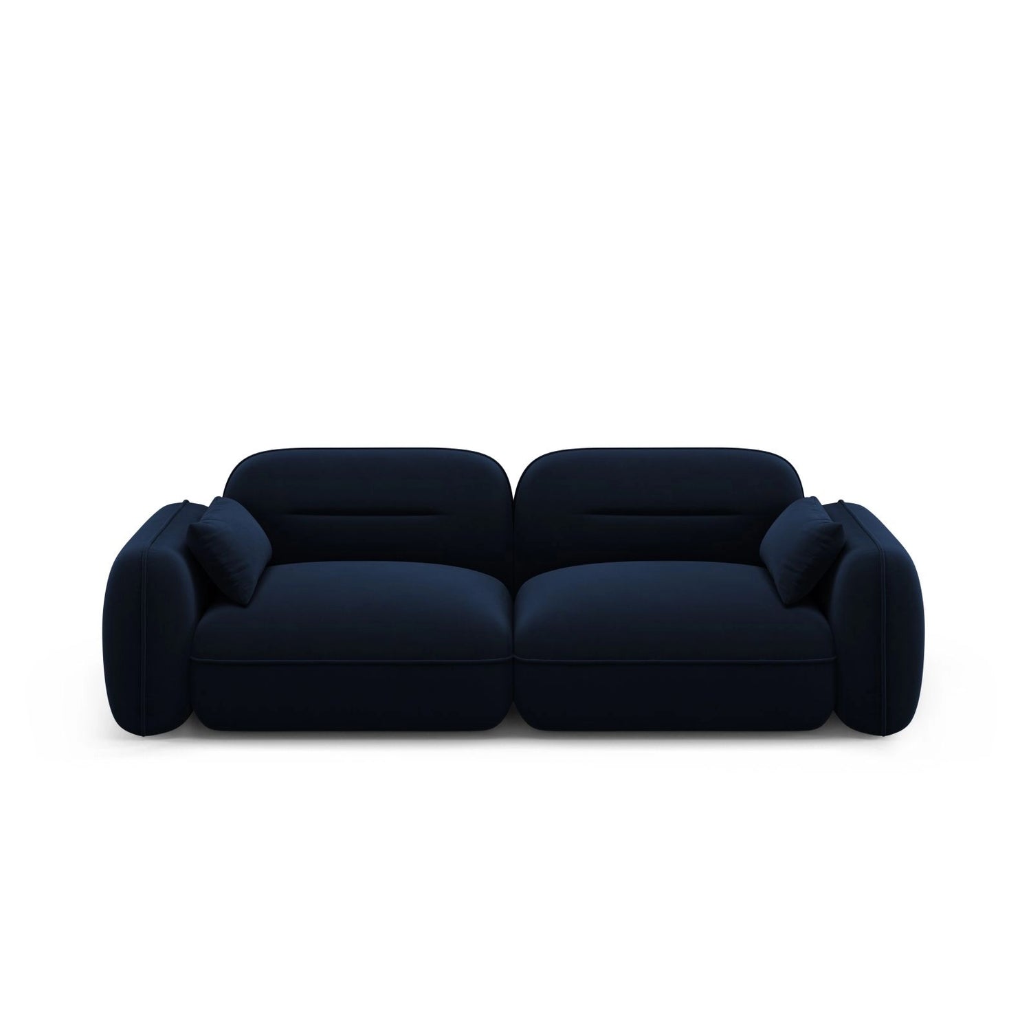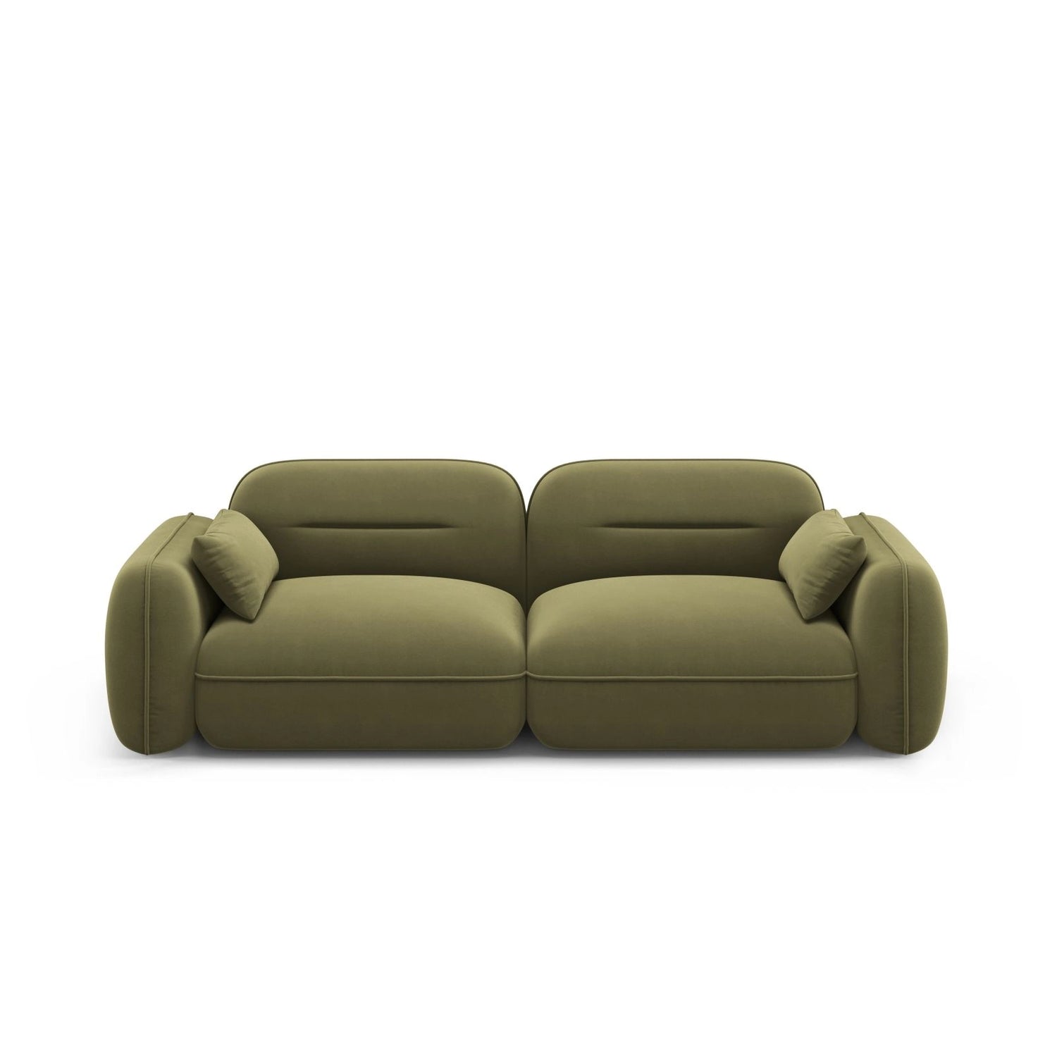 Der Bezug besteht aus hochwertigem, weichem Velours mit feinem Glanz und einer gleichmäßigen Oberfläche. Die Polsterung ist mit Polyurethanschaum (35 kg/m³) gefüllt, während der Rücken mit einer Kombination aus Polyurethanschaum (25 kg/m³) und elastischen Gurten ausgestattet ist. Die stabile Konstruktion aus massivem Kiefernholz, Spanplatten, Faserplatten und Sperrholz sorgt für Langlebigkeit. Das Sofa verfügt über integrierte Federn und steht auf schwarzen Kunststoffbeinen mit einer Höhe von 2 cm.
