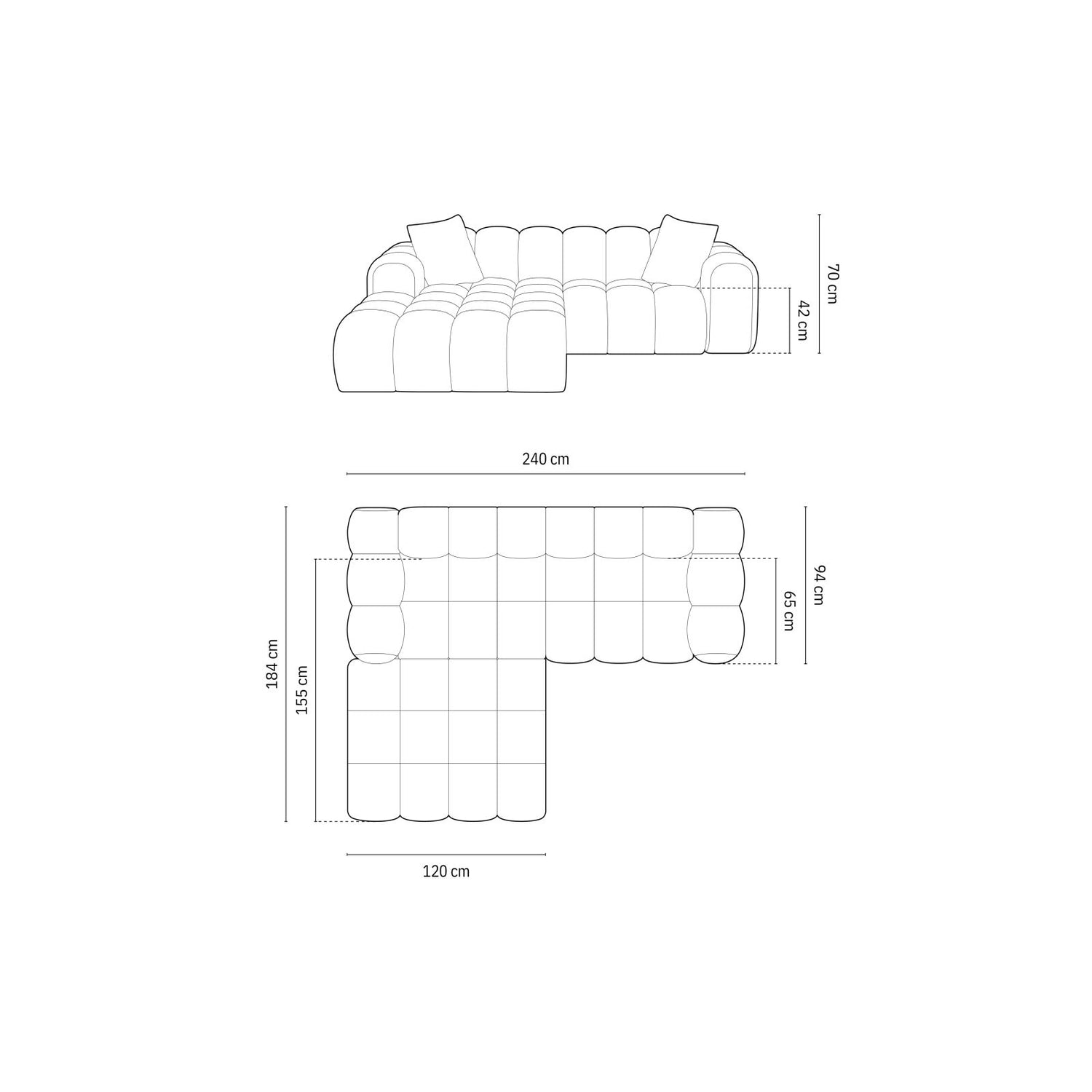 Das Sofa eignet sich für moderne Wohnräume und bietet mit seiner klaren Formensprache und dem neutralen Farbton vielseitige Gestaltungsmöglichkeiten. Die Armlehnen sind 30 cm breit und 64 cm hoch, die Sitzhöhe beträgt 42 cm, die Sitztiefe 65 cm. Die Meridienne misst 85 cm in der Breite und 160 cm in der Tiefe. Die Gesamtabmessungen betragen 240 x 184 x 70 cm (L x B x H).