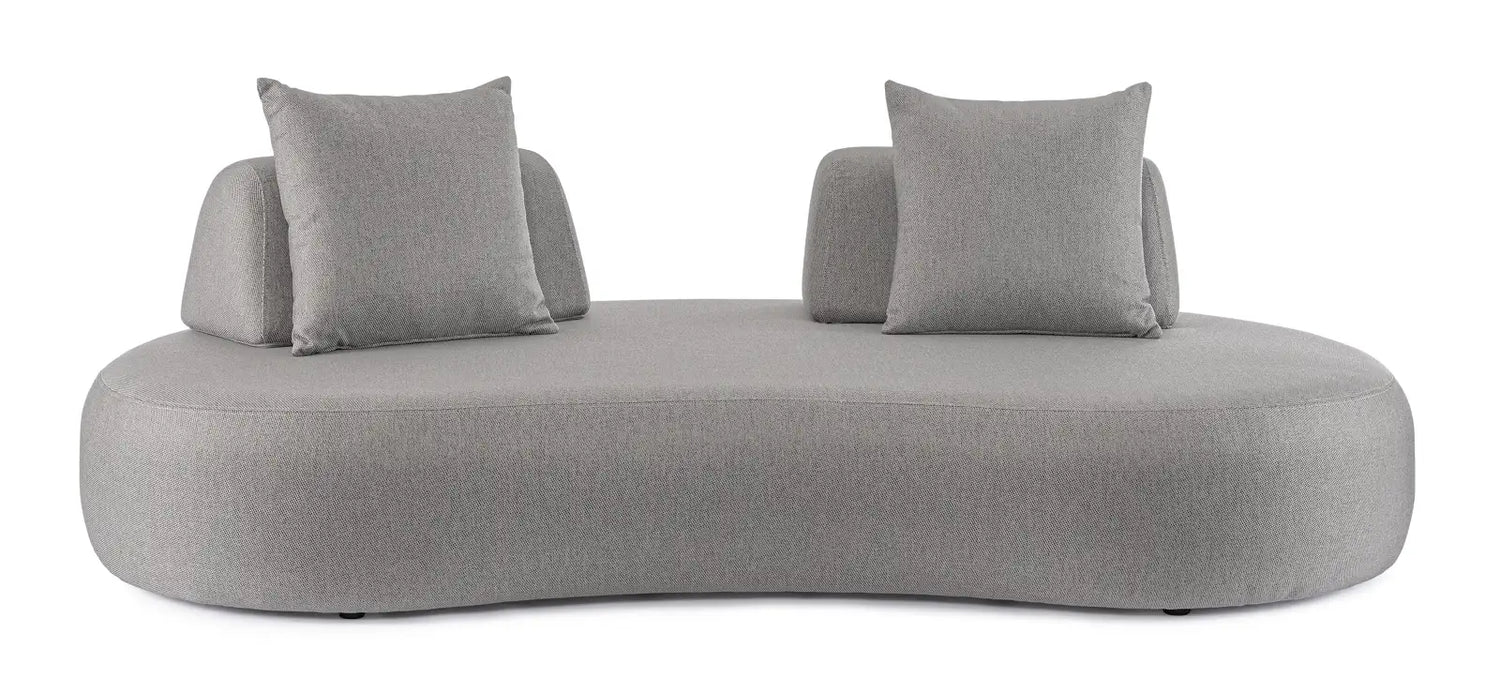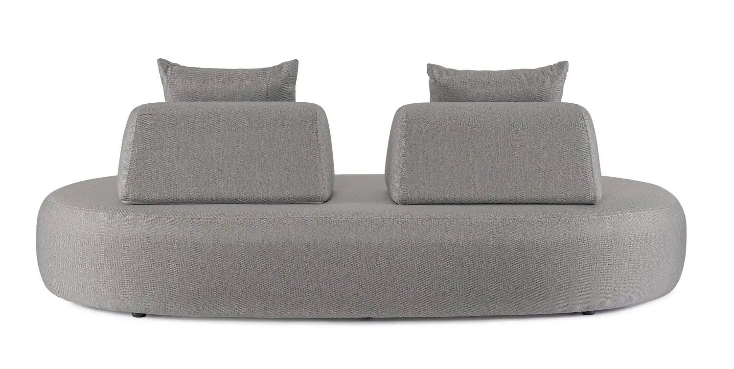 Sofa mit Aluminiumgestell. Abnehmbare Rückenlehnen mit feuerverzinktem und pulverbeschichtetem Stahlrahmen (Polyester). Rückenlehnen und Kissen mit abnehmbaren Bezügen aus Olefin-Outdoor-Gewebe (100 % Polypropylen, 285 g/m²), wasserabweisend und UV-beständig (Grad 7). Die Innenkissen sind wasserdicht und mit einem Gewebebezug (Polyurethan) ausgestattet.