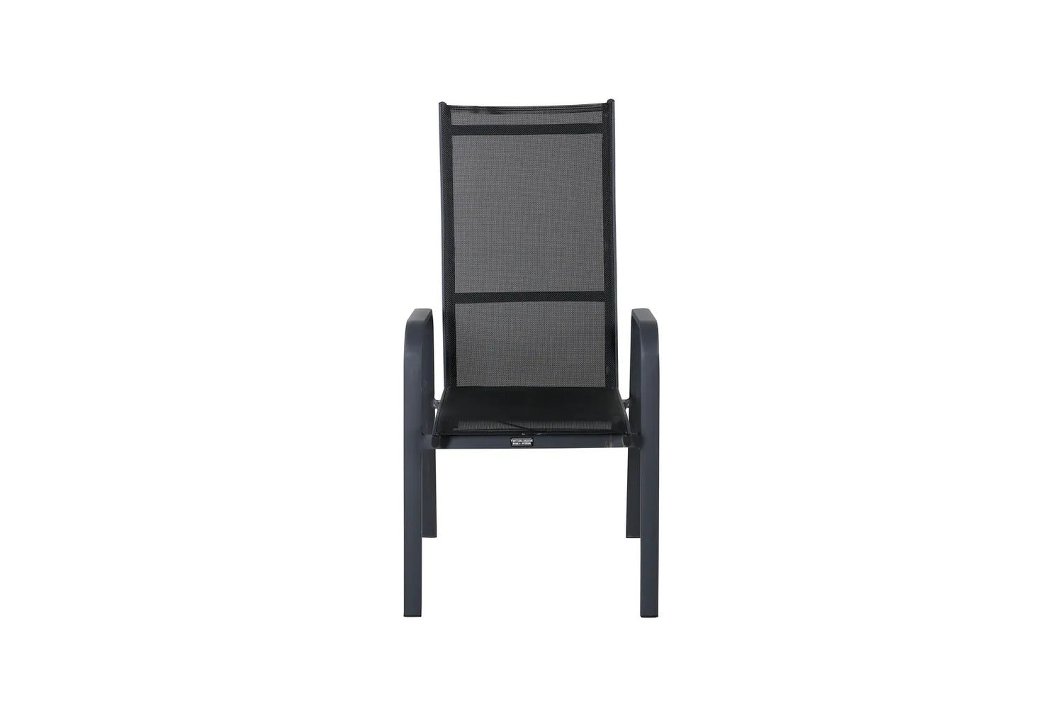 Copacabana ist ein moderner, stapelbarer Sessel in schwarzer Farbe, der sich besonders gut am Esstisch auf dem Balkon eignet. Die Rückenlehne des Sessels ist verstellbar, was ihn sehr komfortabel und praktisch macht. Der Bezug besteht aus Textilene, einem synthetischen Gewebe aus PVC-behandeltem Polyester, das wasserresistent und UV-behandelt ist, um dem Ausbleichen durch Sonnenlicht entgegenzuwirken. Die Reinigung sollte etwa einmal im Monat mit einem feuchten Tuch erfolgen, anschließend ist der Bezug zu trocknen.