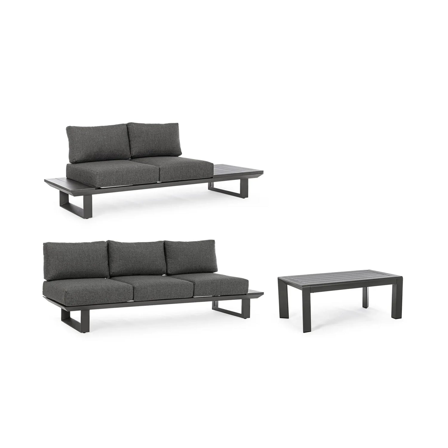 Aluminium mit Pulverbeschichtung (Polyester). Abziehbare Kissen aus Olefin Stoff (100% Polypropylen). Beine und Rücklehnen zu montieren.