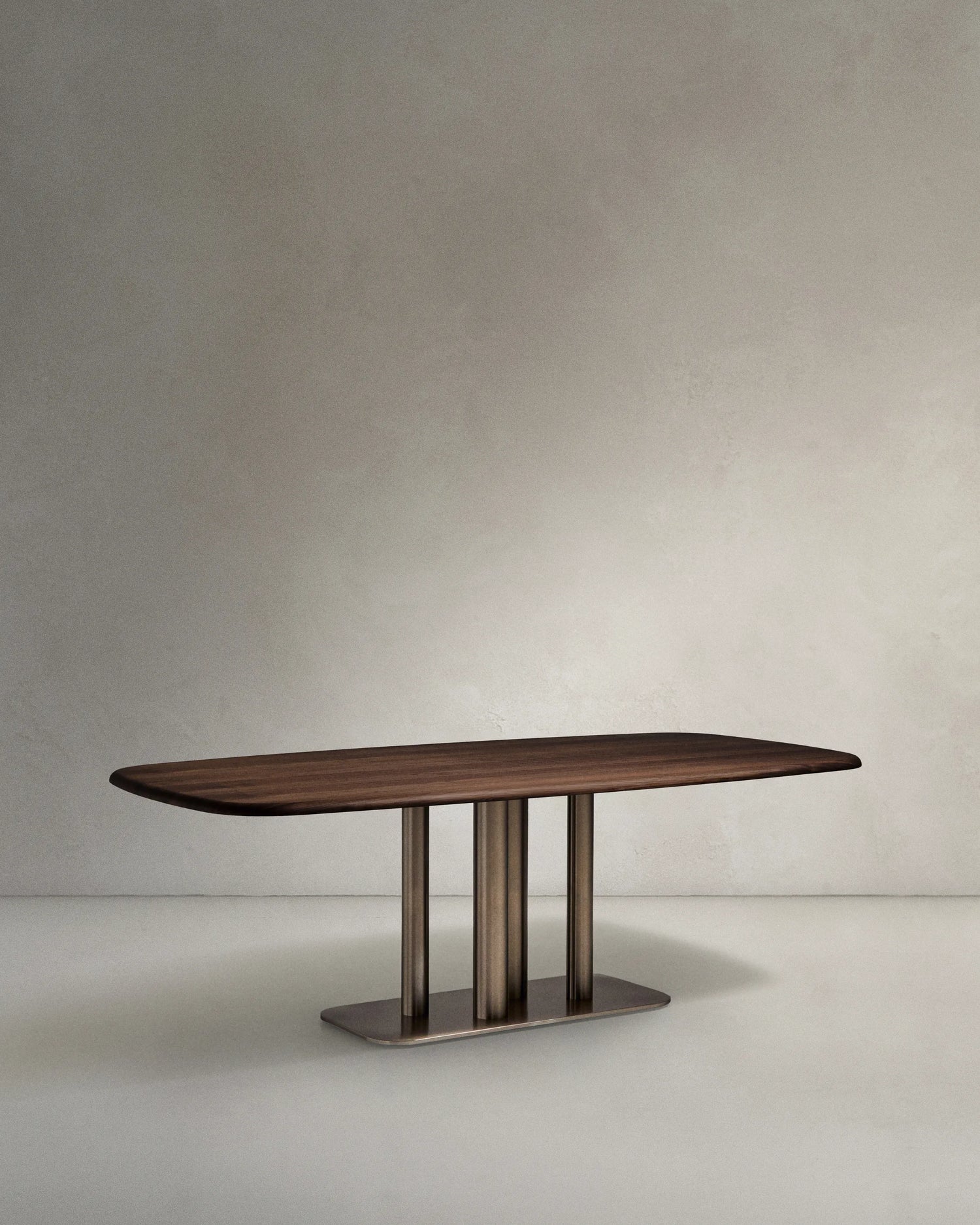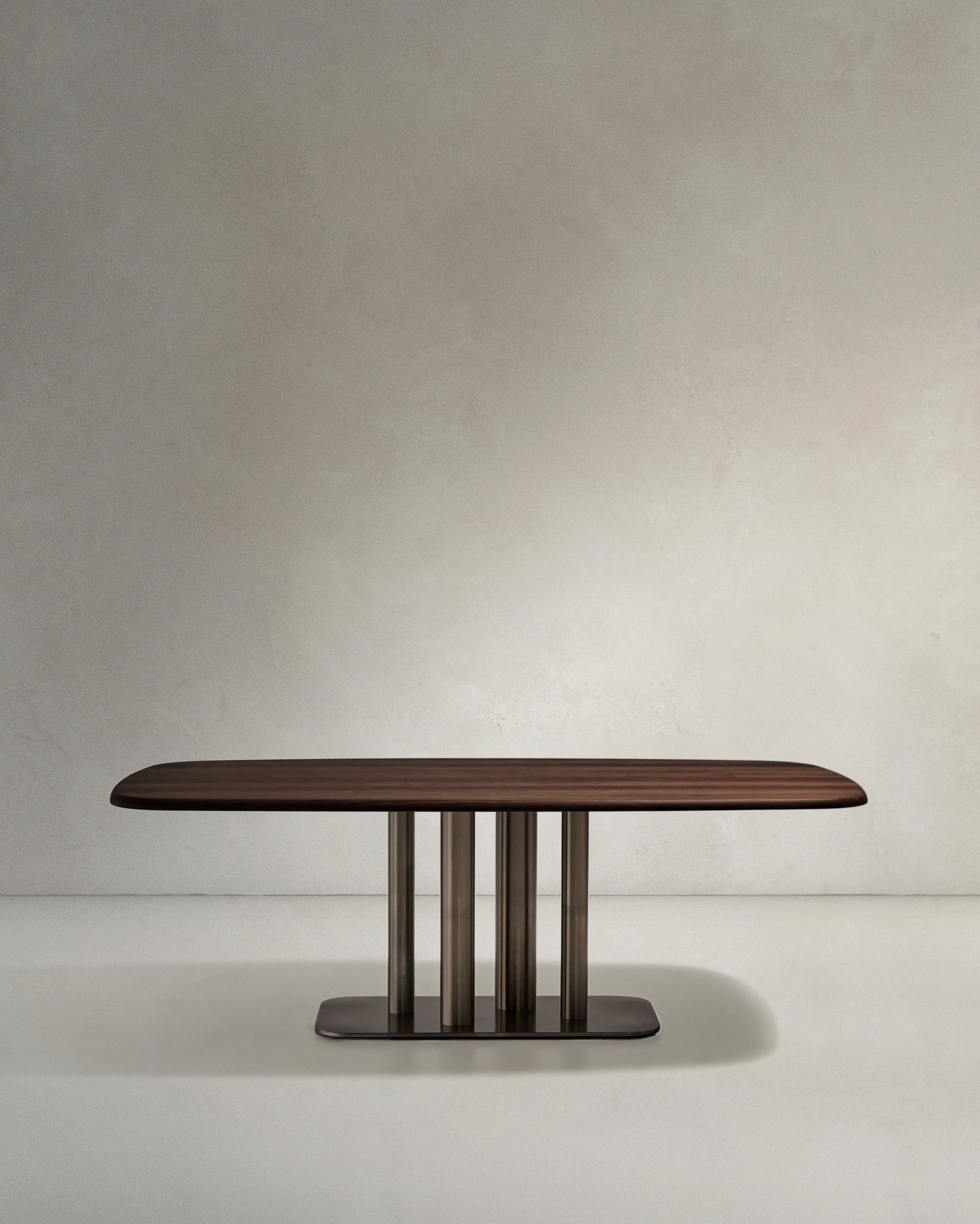 Tisch Melvar aus Nussbaumfurnier FSC 100 % und Beine mit gebürsteter Edelstahlbasis 220 x 110 cm