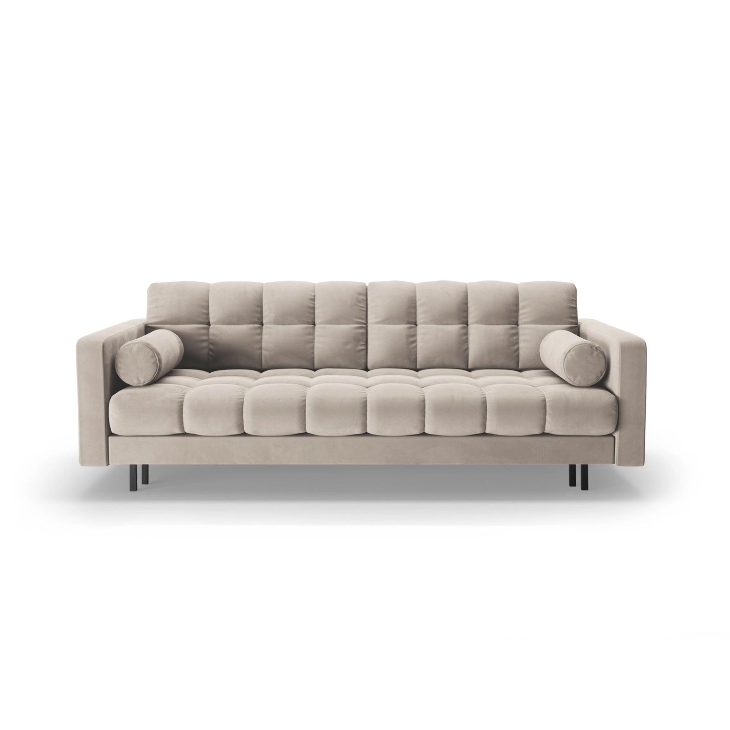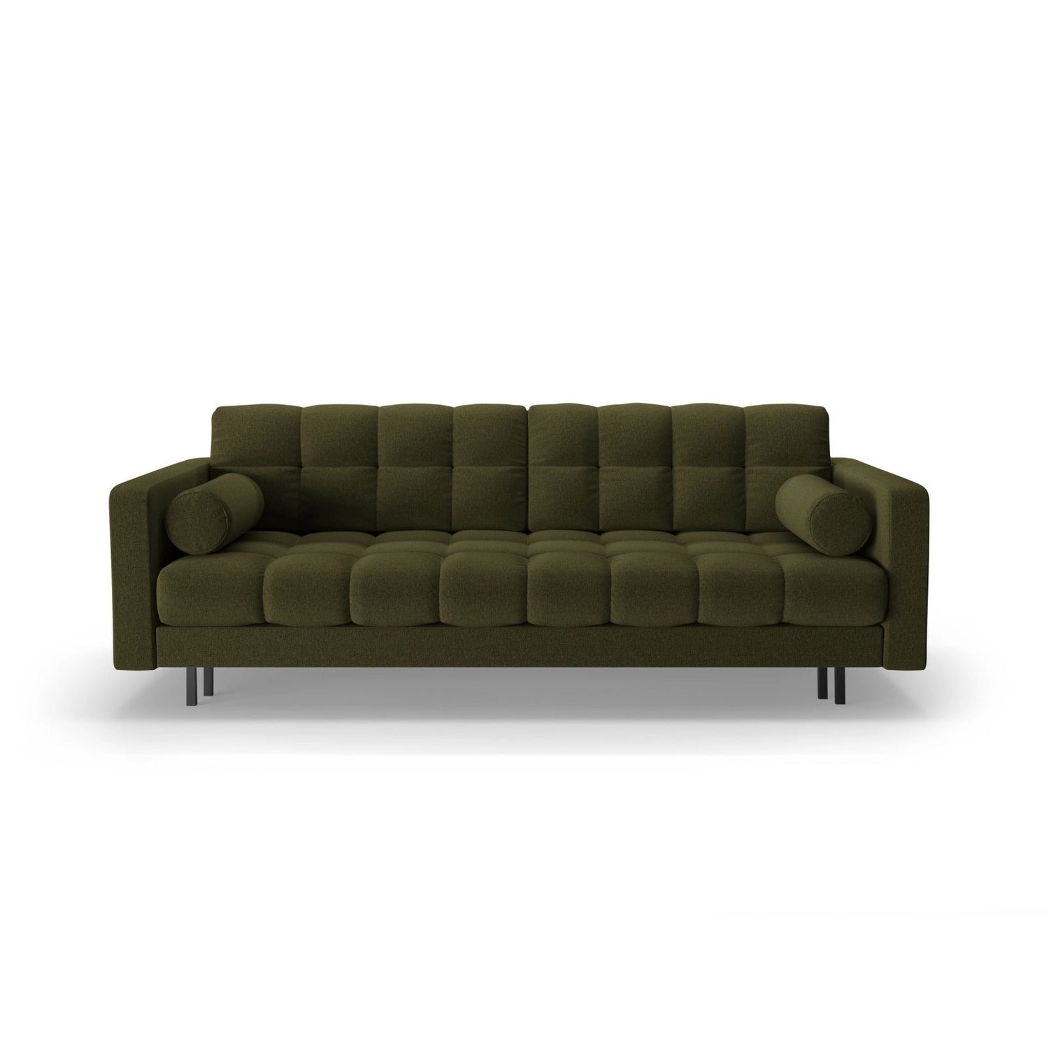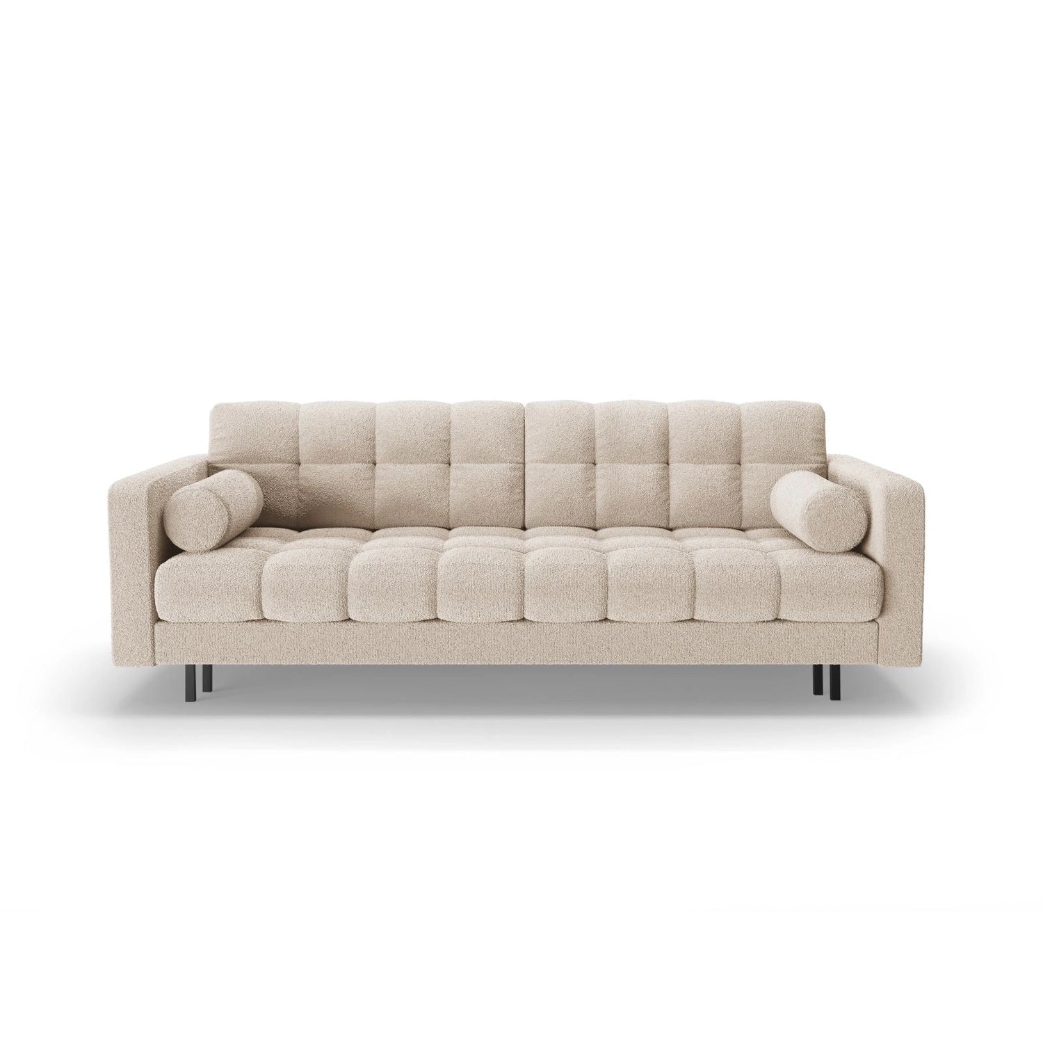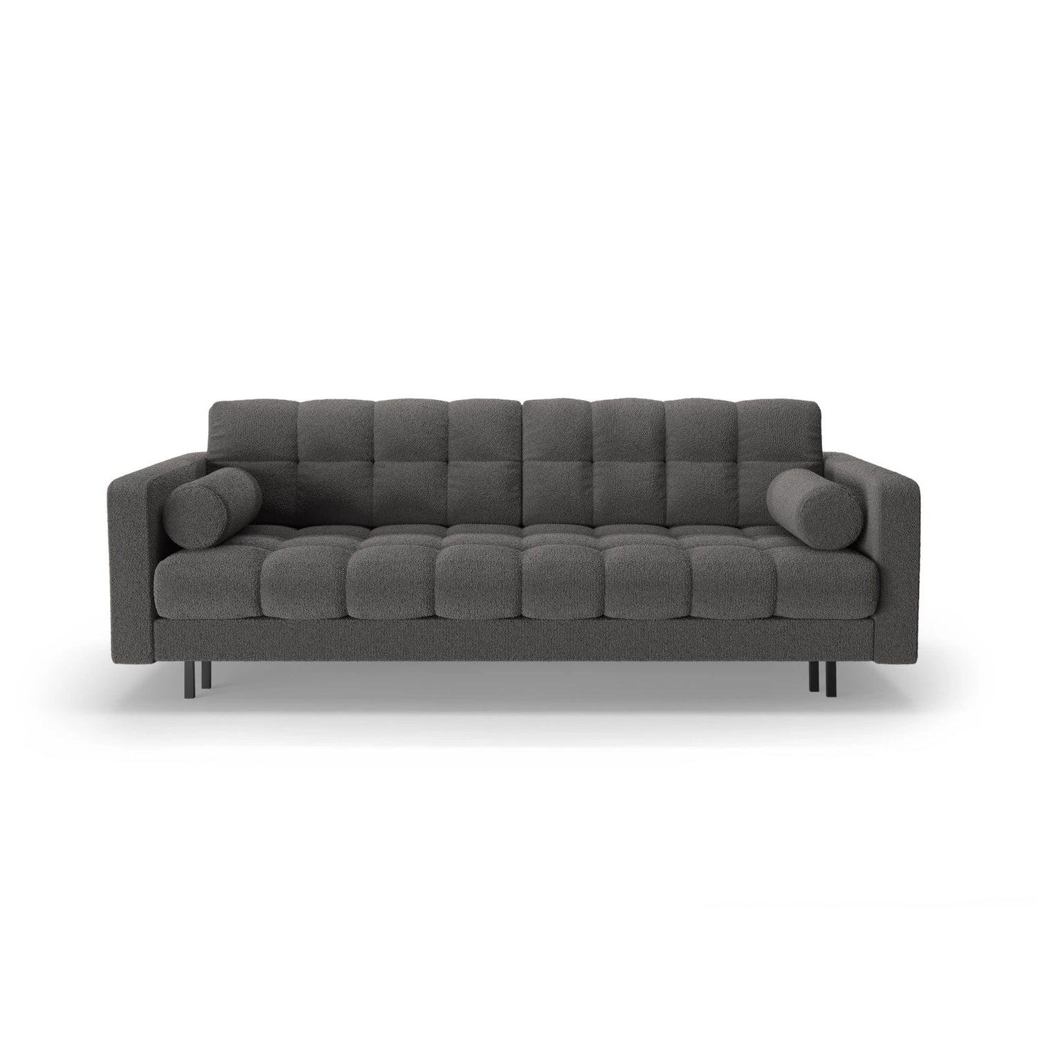 Der Bezug besteht aus dicht gewebtem Bouclé-Stoff (Baloo 2073) mit einer hohen Abriebfestigkeit (Martindale 100.000) und ist Oeko-Tex® zertifiziert. Die stabile Konstruktion aus massivem Kiefernholz, Spanplatten, Faserplatten und Sperrholz wird durch eine Federung ergänzt. Die Beine sind aus schwarzem Metall gefertigt und sorgen für eine elegante Optik.