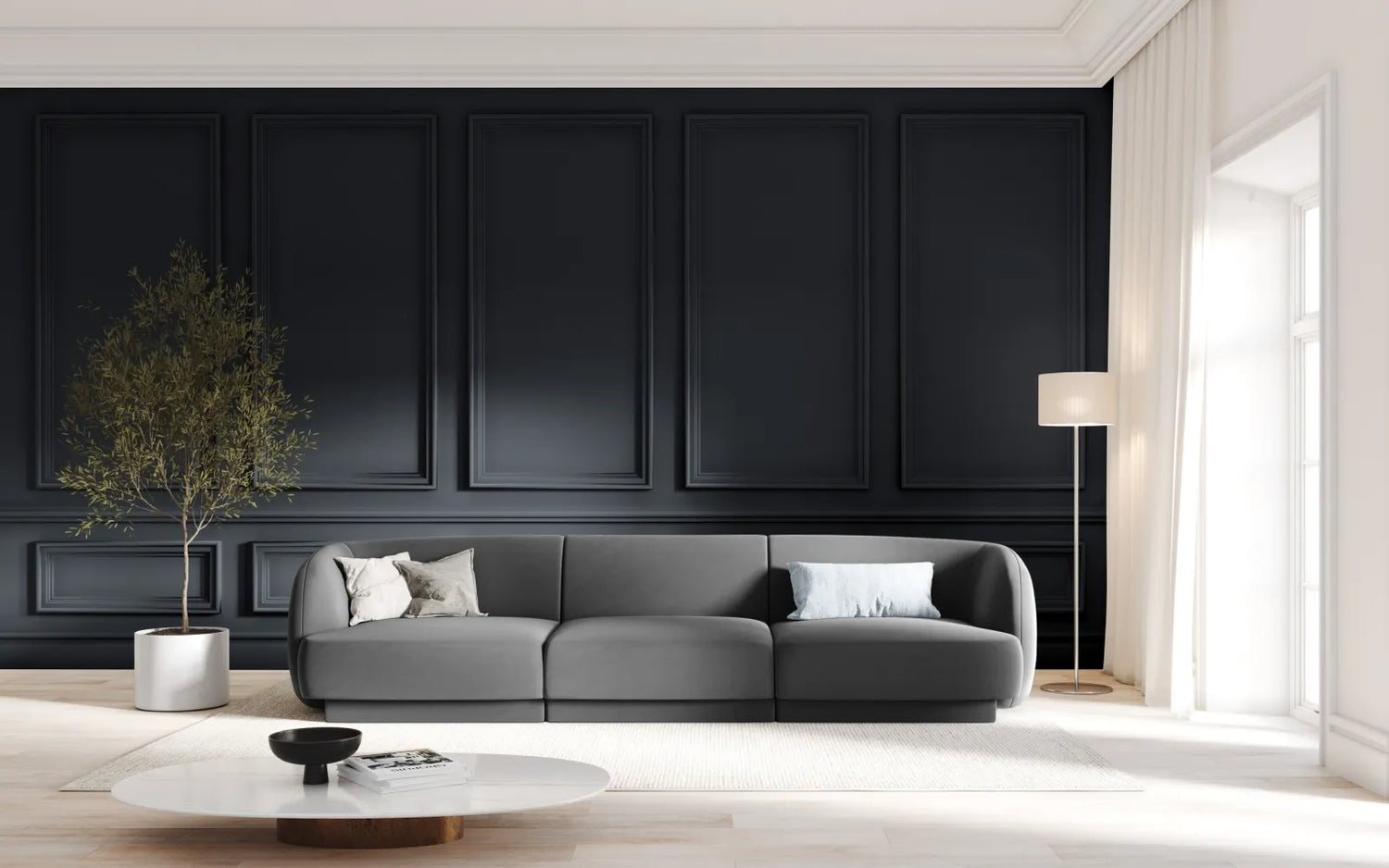 Die modernen Miley-Sofas beeindrucken durch ihre abgerundeten Strukturen, die perfekt zu den neuesten Einrichtungstrends passen. Zusätzlich zu ihrer einzigartigen, minimalistischen Form zeichnen sie sich durch außergewöhnlichen Komfort aus. Die niedrige, umhüllende Rückenlehne geht sanft in profilierte Armlehnen über, wodurch ein sehr einheitlicher und natürlicher Look entsteht. Außerdem bietet sie in jeder Position, ob im Sitzen oder im Liegen, eine angenehme Unterstützung. Abgerundete Sitze mit dicker und federnder Füllung fördern die Entspannung. Das Design basiert auf einer kleinen Erhebung, die den Eindruck erweckt, über dem Boden zu schweben. Wenn Sie auf der Suche nach Harmonie mit Stil sind, werden die Miley-Sofas Ihre Erwartungen perfekt erfüllen.