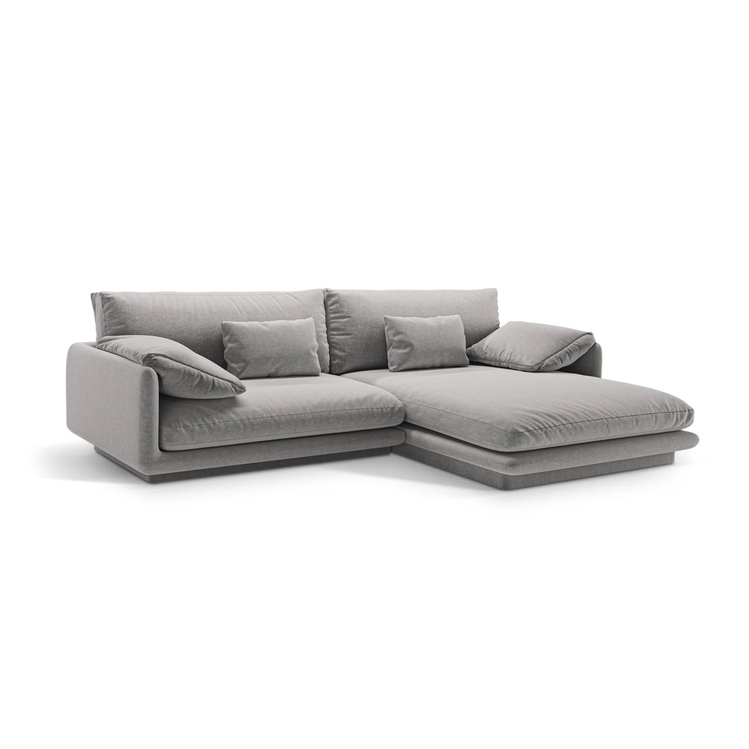 Die klassische Silhouette des Ecksofas Torino, Rechte Seite, von Micadoni hat moderne Proportionen. Sein vielseitiges Design zeichnet sich durch innovative Armlehnen aus. Die hohe Verarbeitungsqualität und die äußerst komfortable Polsterung sind beeindruckend. - Das Sofa hat einen weichen Sitz mit hoher Elastizität. - Das verdankt es den gewellten Federn im Sitz und einer dicken Schicht aus Reaktionsschaum. - Die weichen Armlehnen sind fest mit dem Kissen verbunden. - Die Kissen an den Armlehnen sind beweglich und können nach außen gekippt werden. - Anstelle von Beinen hat das Sofa einen leicht vertieften Sockel, der es so aussehen lässt, als würde es über dem Boden schweben. Dieses Sofa hat bewegliche Kissen, die an den Armlehnen festgenäht sind. Die Basis des Möbels ist gepolstert.