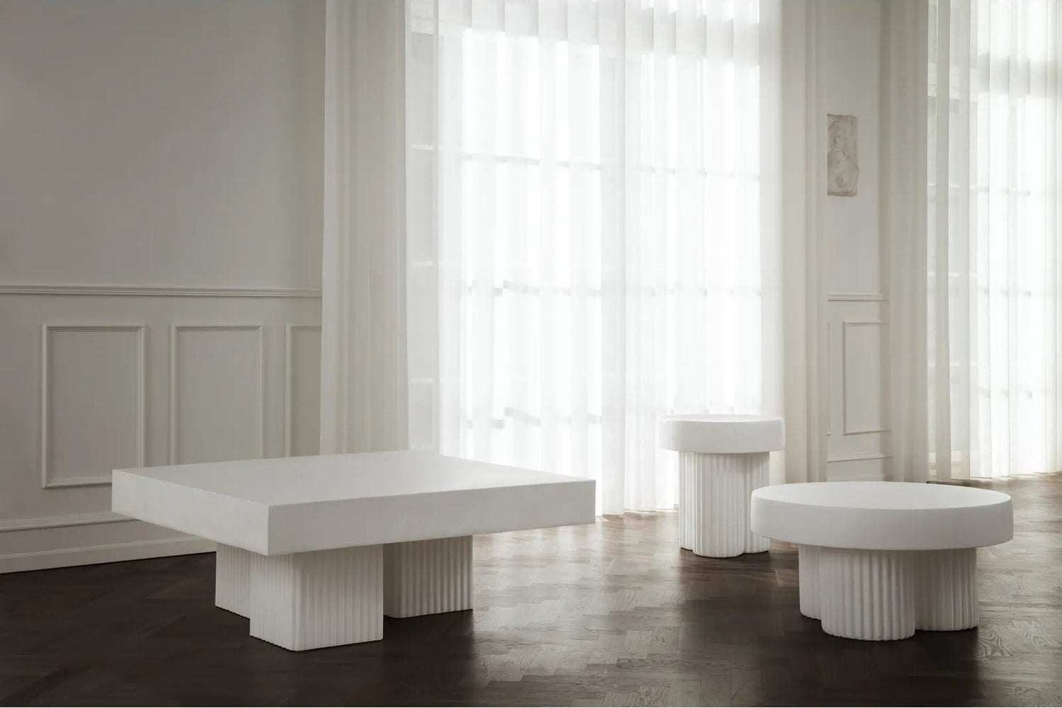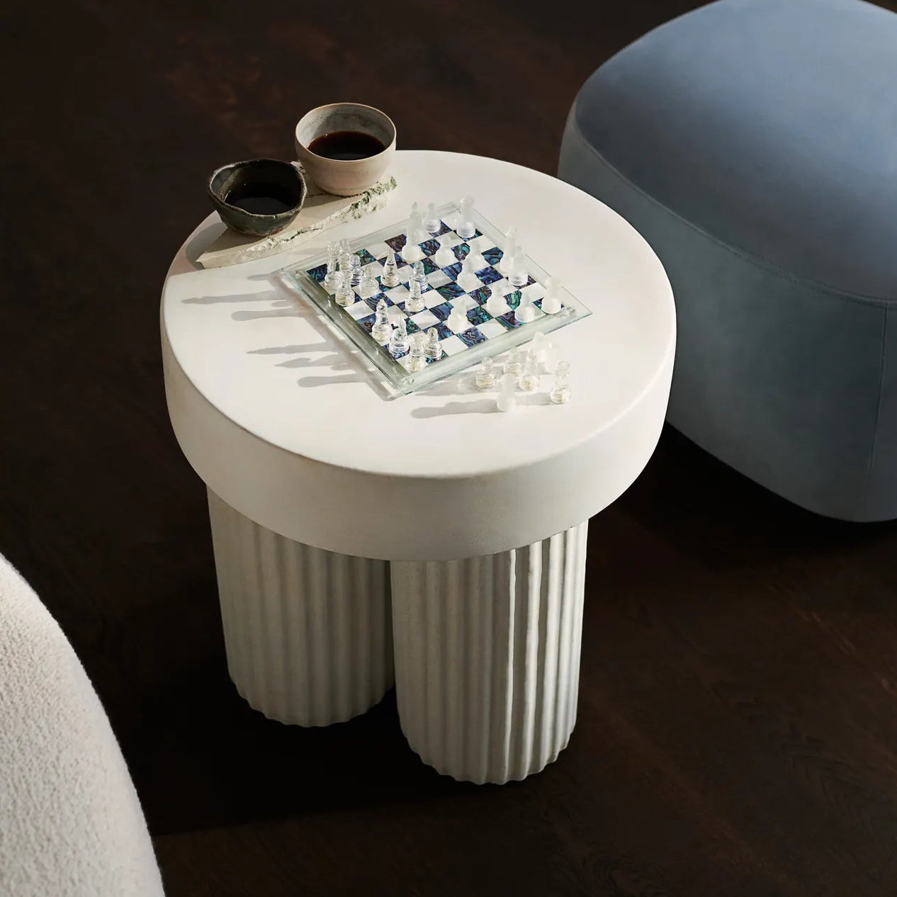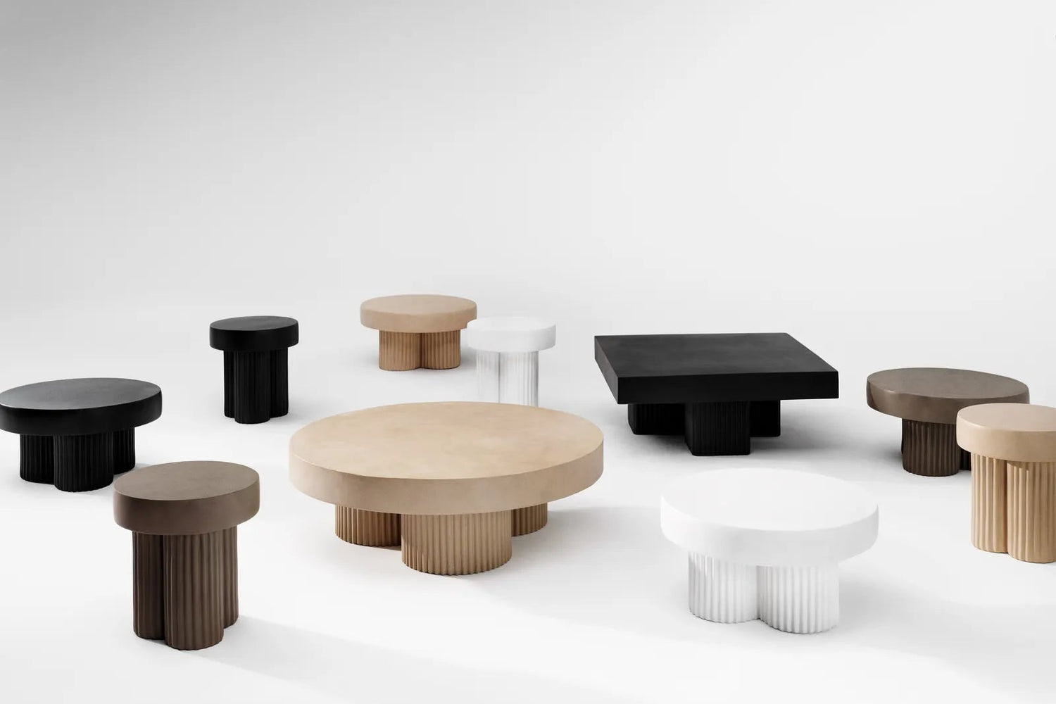 Der Gear Tisch besteht aus einer massiven Tischplatte, die auf drei zylinderförmigen Beinen mit gerillten Details ruht. Jeder Tisch wird in einem Guss aus einer leichten Mischung aus Beton und Magnesiumoxid gefertigt.