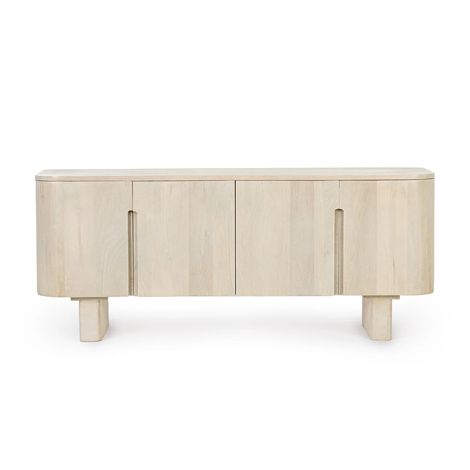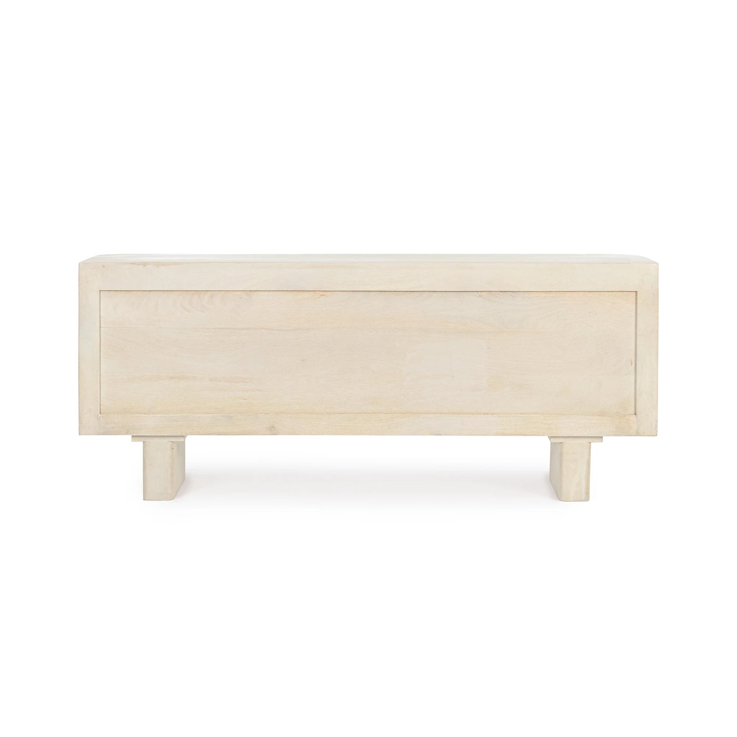 Gestell aus Mangoholz. Rückseite aus MDF. Feinbearbeitung aus Nitrozellulose. Beine zu montieren.