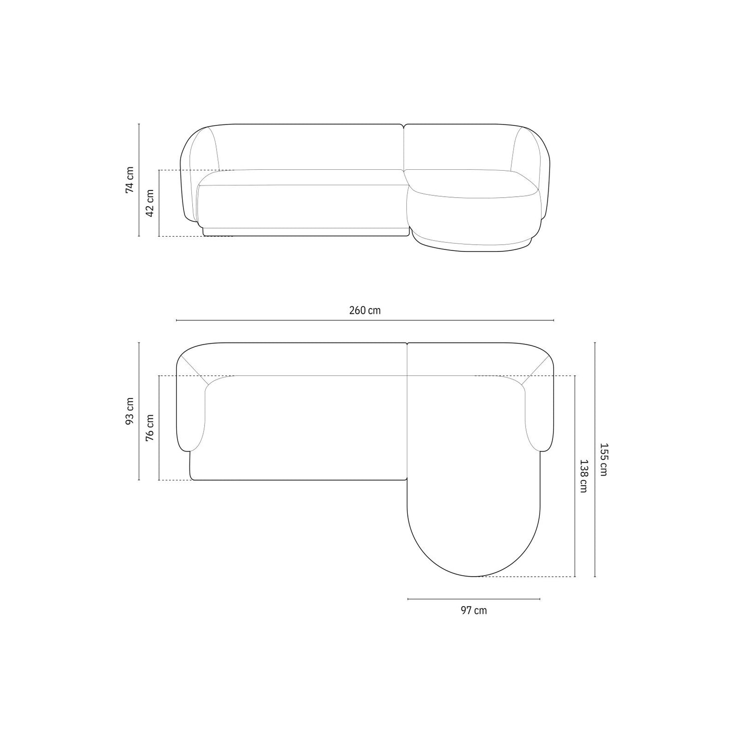 This sofa is ideal for modern living spaces, offering a contemporary addition to any room with its generous reclining area and clean lines. It measures 260 cm in length, 155 cm in depth, and 74 cm in height. The seat height is 42 cm, the backrest height is 32 cm, and the armrests are 17 cm wide and 55 cm high. The chaise longue measures 80 cm in width and 138 cm in depth.