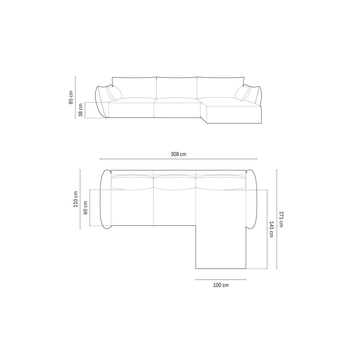 308cm x 171cm x 85cm (length x width x height)