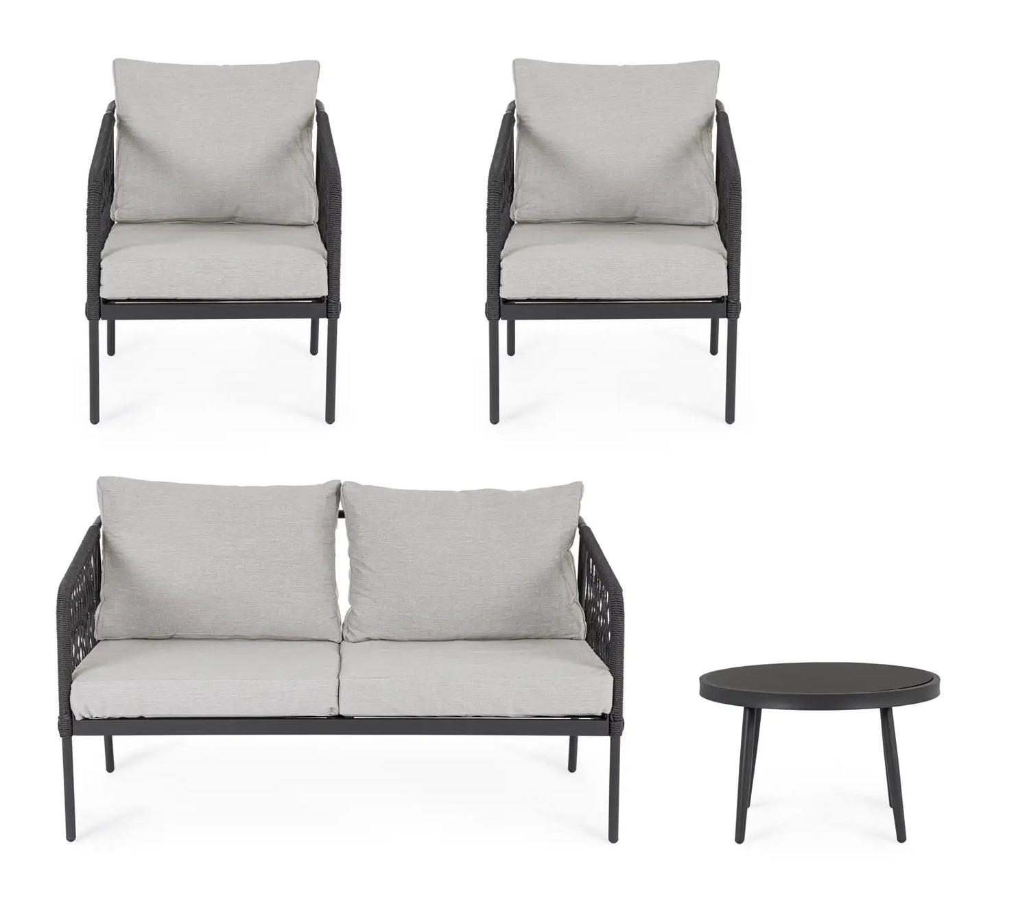 Powder-coated aluminum (polyester) frame. Synthetic fiber weave. Seat made of 2x1 Textilene, 550 g/m². Cushions with removable covers made of water-repellent spunpoly fabric, 220 g/m². Coffee table with painted, tempered glass top (5 mm thick). Galvanized steel screws. Self-assembly required.