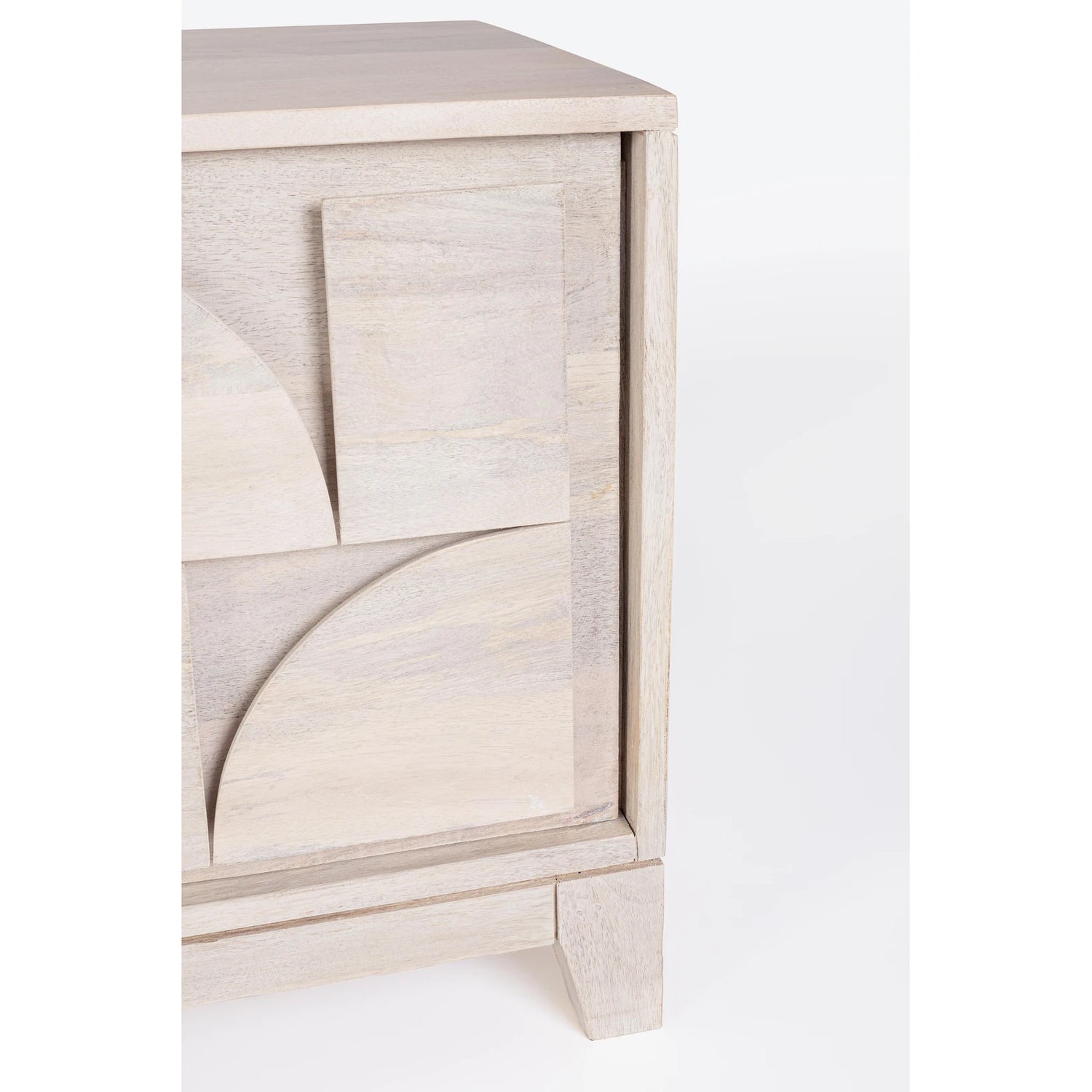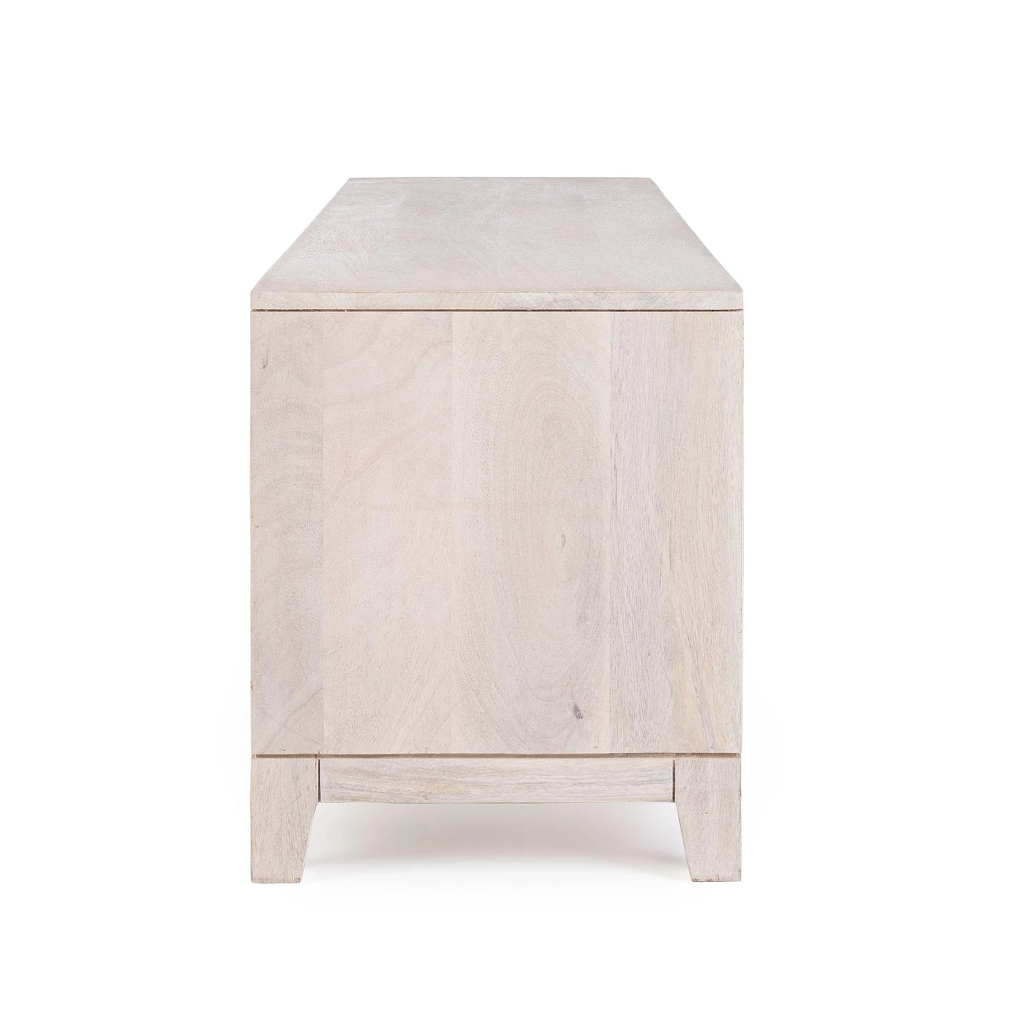 Mango wood frame, MDF back and drawer base. Nitrocellulose lacquer finish with white stain. Door compartment with shelf.