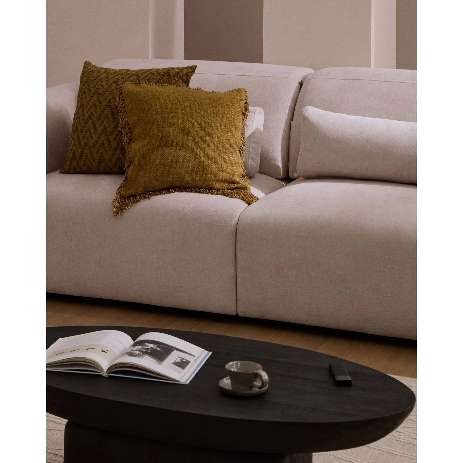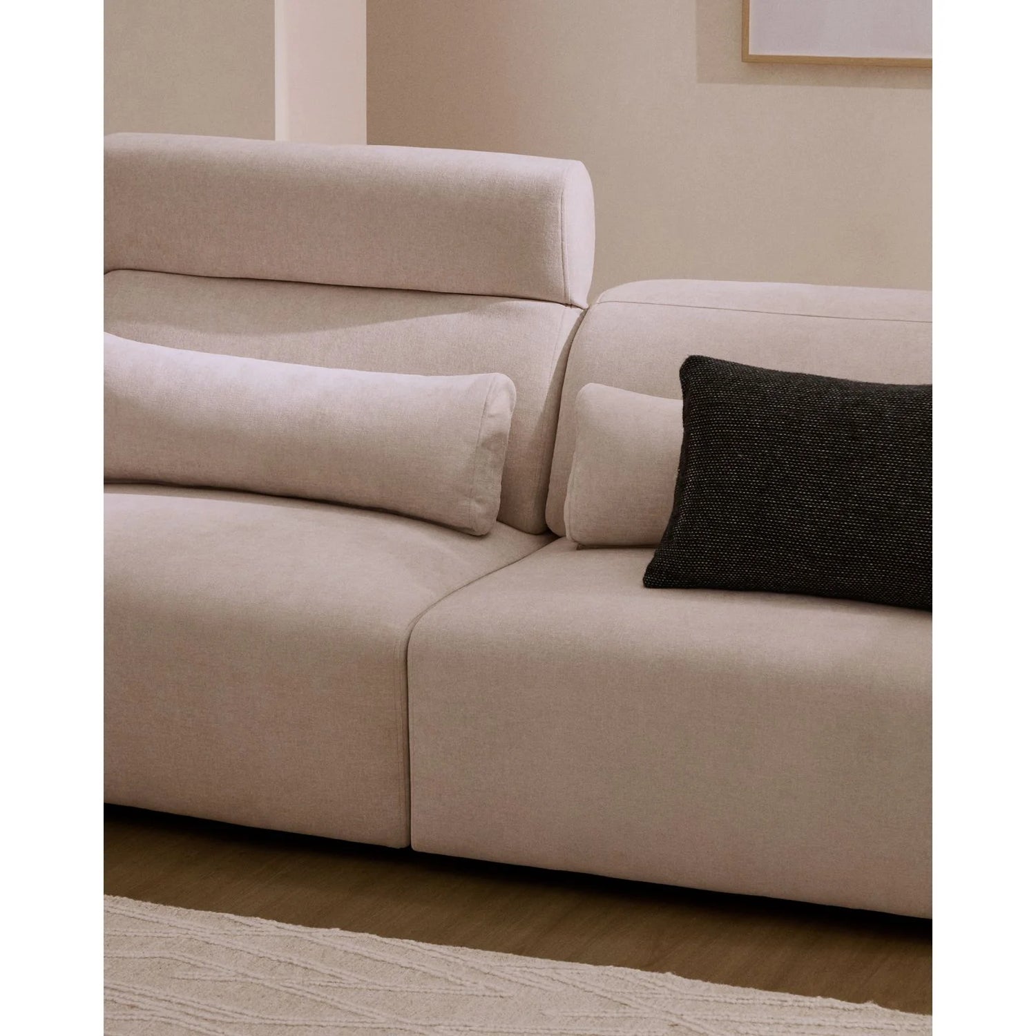 Lares 5-seater sofa with electrically extendable seats and adjustable headrest in beige chenille, 335 cm
