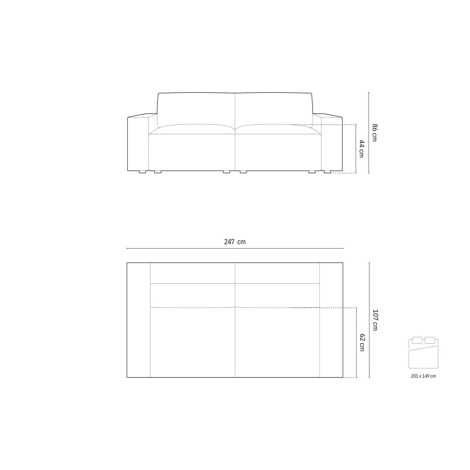 247cm x 107cm x 86cm (length x width x height)