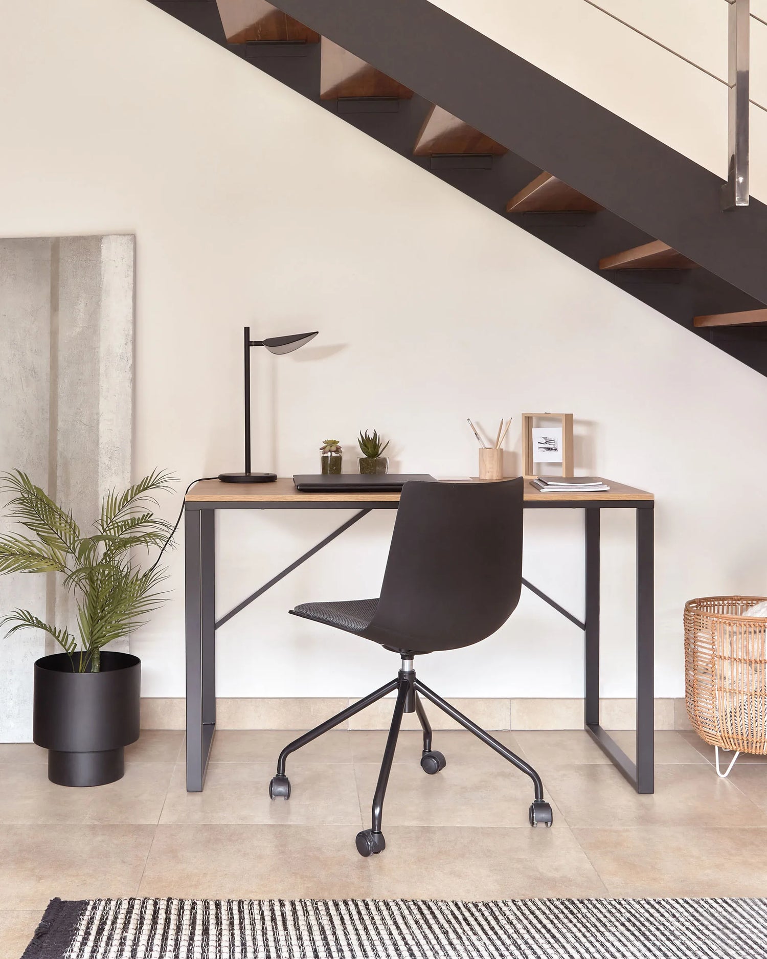 Bureau avec plateau en MDF couleur naturelle et structure en métal peint. Hauteur : 76 cm.