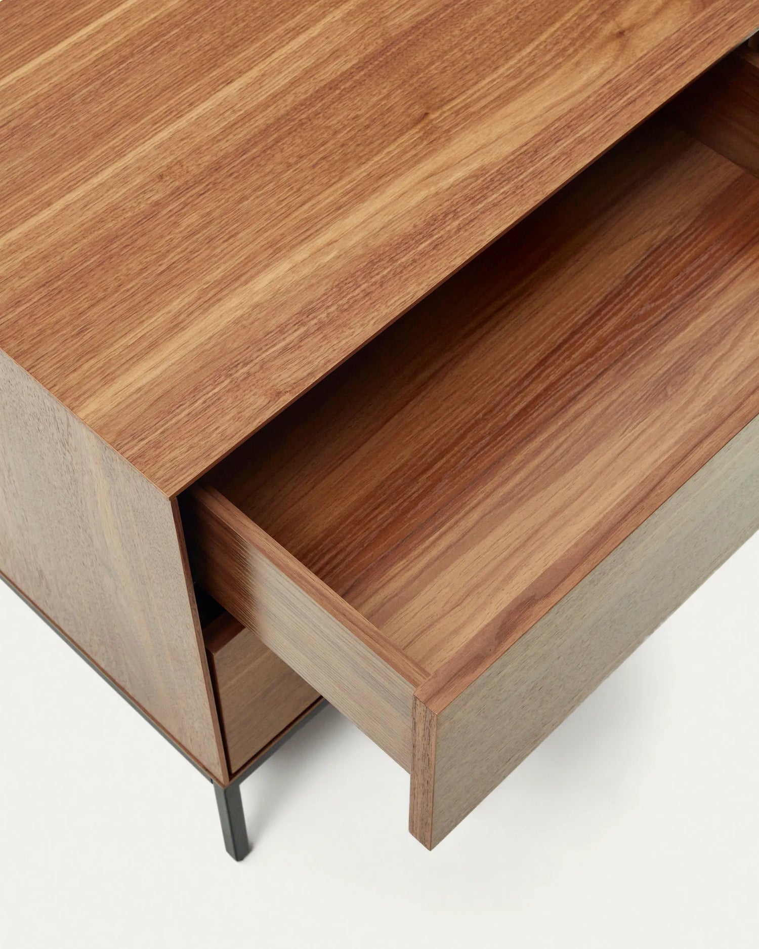 Table de chevet Vedrana avec 2 tiroirs en placage de noyer et pieds en acier noir, 60 x 55 cm