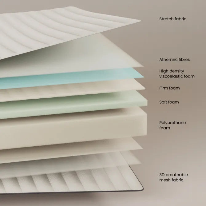 Tissu extensible : Une première couche au confort exceptionnel qui épouse délicatement les contours de votre corps. Sa souplesse accompagne chaque mouvement d'une sensation de légèreté et de bien-être, permettant une plus grande liberté de mouvement sans perdre le soutien nécessaire. Cette couche est conçue pour offrir un sommeil enveloppant et agréable. Fibres athermiques : Composée de fibres athermiques, cette couche améliore la respirabilité du matelas en assurant une ventilation constante et en régulant la température corporelle pendant le sommeil. Ces fibres athermiques ne retiennent pas la chaleur, pour un sommeil frais et confortable. Mousse viscoélastique haute densité : Une couche de mousse viscoélastique haute densité qui épouse les formes de votre corps, offrant un soulagement personnalisé des points de pression. Cette technologie garantit un soutien ergonomique et une sensation de confort enveloppant, créant une expérience de sommeil optimale. De plus, sa capacité à reprendre sa forme initiale après chaque utilisation assure une longévité exceptionnelle. Mousse ferme : La mousse polyuréthane ferme de ce matelas est conçue pour offrir un soutien ferme et résilient, idéal pour ceux qui recherchent une surface de couchage plus ferme. Ce matériau garantit une durabilité et une stabilité exceptionnelles en préservant la forme du matelas et en permettant un bon alignement de la colonne vertébrale. Outre sa résilience, la mousse polyuréthane ferme contribue à une répartition uniforme du poids, prévenant ainsi toute déformation au fil du temps et assurant une plus longue durée de vie au matelas. Mousse souple : Une couche de mousse supplémentaire de 4 cm recouvre le noyau ferme. Bien que conservant la même densité de 26 kg/m³, sa composition est plus moelleuse et offre un niveau de confort et d’amortissement supérieur. Cette couche est conçue pour apporter plus de douceur au matelas, créant une surface plus accueillante et confortable. Mousse polyuréthane : Le noyau de ce matelas est composé d’une couche de 15 cm de mousse polyuréthane, un matériau reconnu pour sa capacité à offrir un équilibre parfait entre soutien et confort. Avec une densité de 28 kg/m³, cette mousse offre une fermeté moyenne, offrant une base stable sans être trop rigide. Pour ceux qui recherchent un soutien plus ferme, ce noyau garantit une structure ferme qui conserve sa forme au fil du temps, procurant une sensation de stabilité et de durabilité pendant le sommeil. Maille 3D respirante : Cette couche garantit une ventilation optimale, permettant à l'air de circuler librement. Conçue pour offrir une respirabilité supérieure, elle contribue à maintenir une température fraîche tout au long de la nuit et à prévenir l'accumulation de chaleur et d'humidité. Cette technologie améliore non seulement votre sommeil, mais contribue également à la longévité du matelas, garantissant son parfait état au fil du temps.