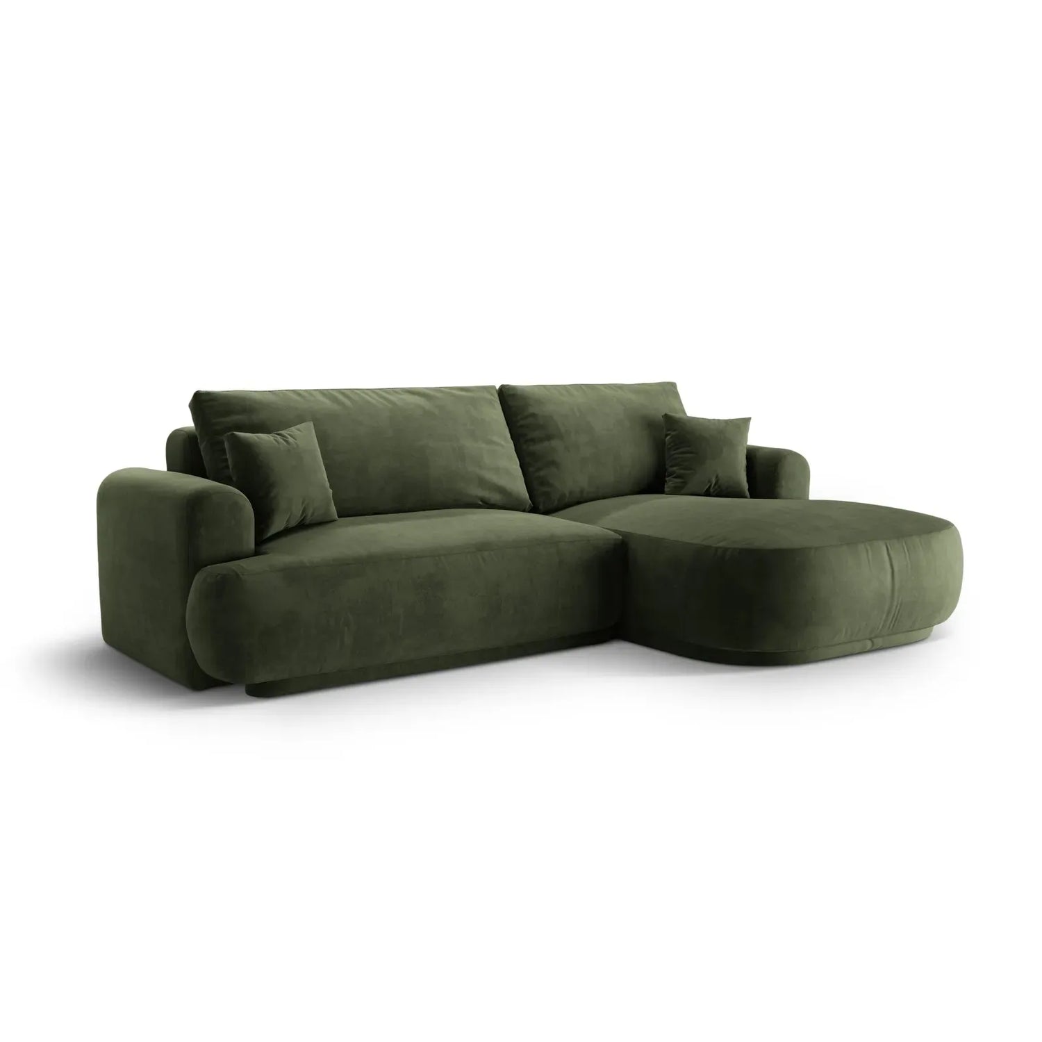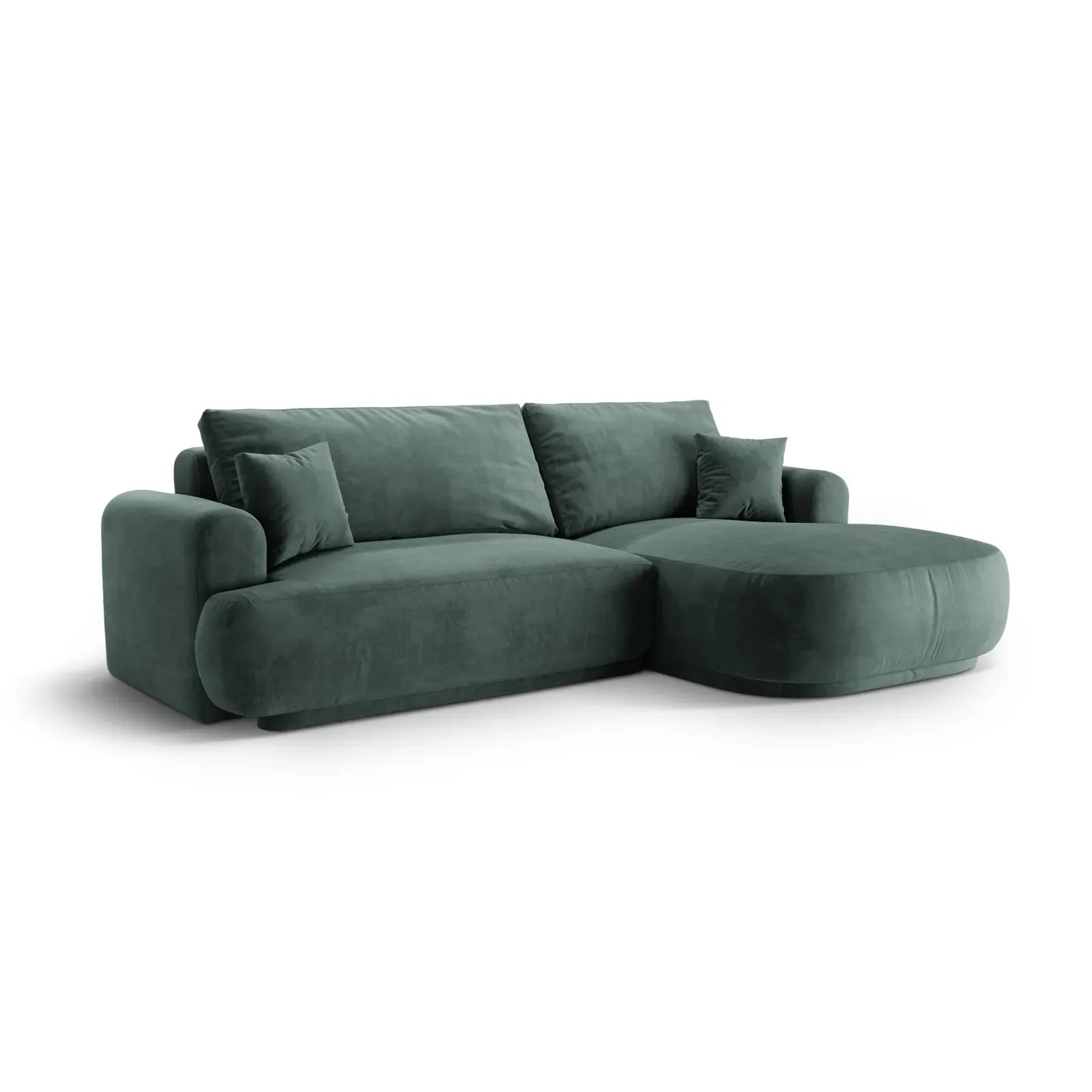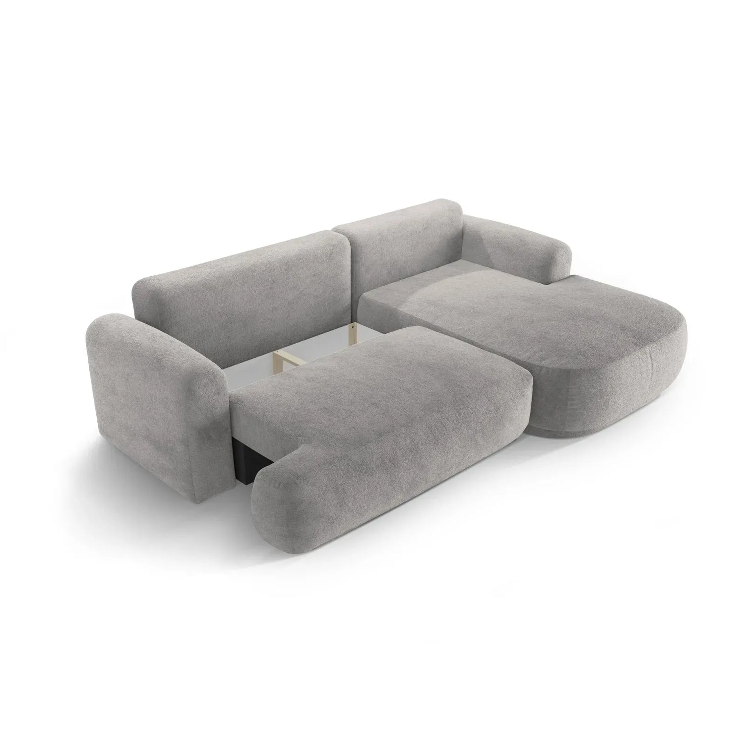 Canapé d'angle droit Ella 4 places avec fonction couchage et coffre de rangement. Revêtement en velours, tissu structuré ou bouclé, 271 x 174 cm.
