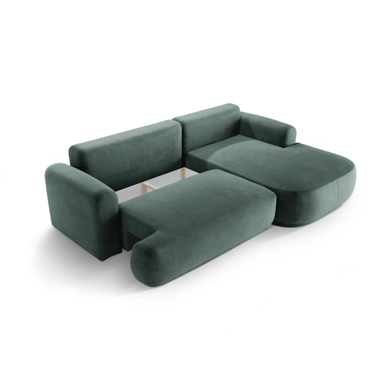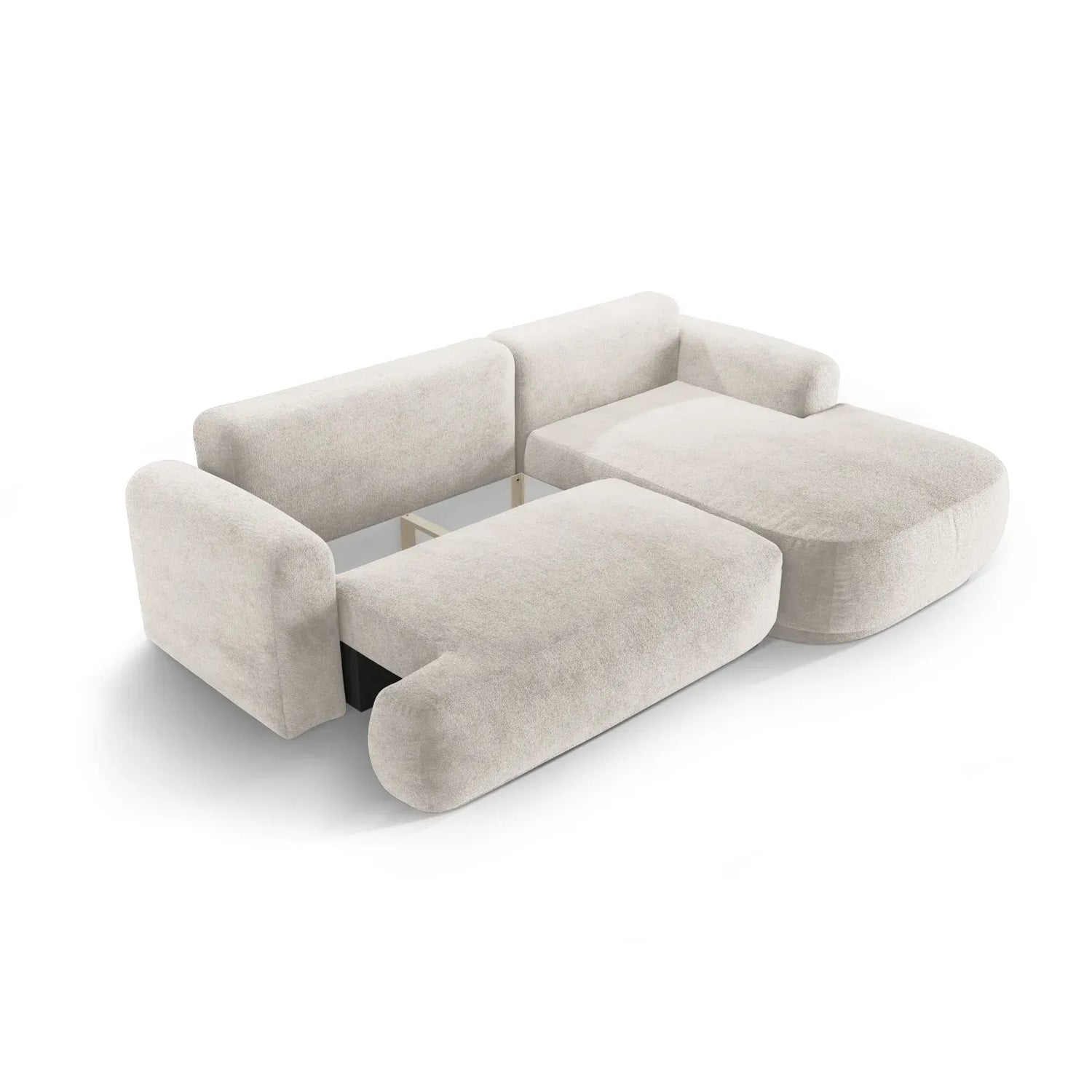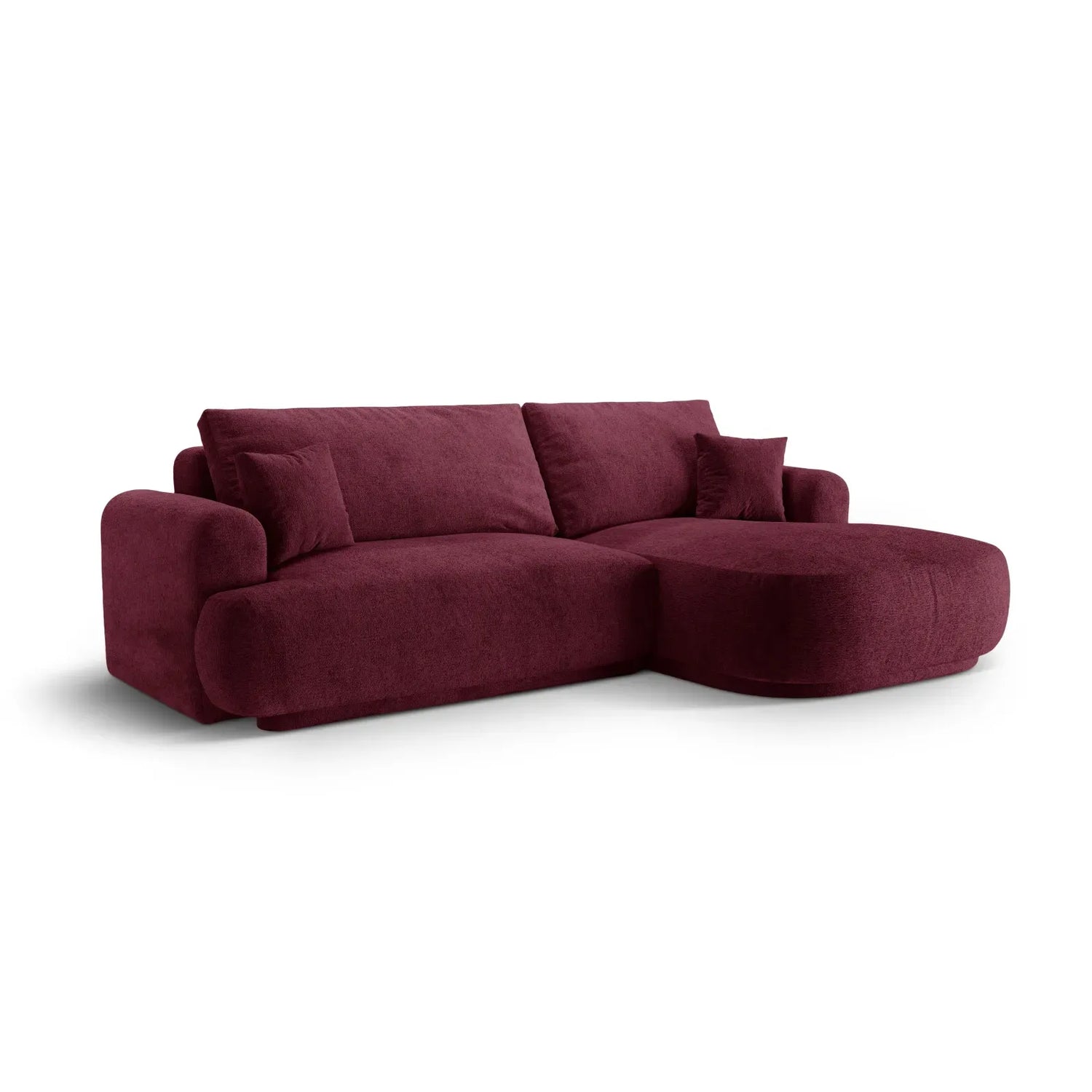 Canapé d'angle droit Ella 4 places avec fonction couchage et coffre de rangement. Revêtement en velours, tissu structuré ou bouclé, 271 x 174 cm.