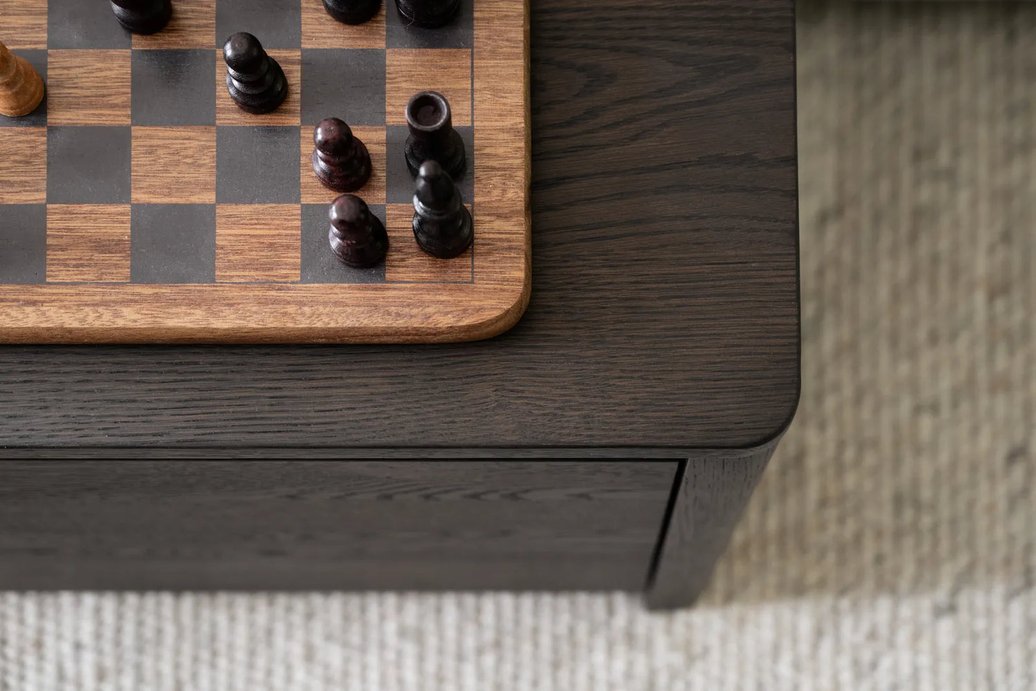 Le buffet bas de la collection Melstone allie rangement astucieux et design élégant. Il peut aussi bien servir de banc d'entrée que d'espace de rangement raffiné dans le salon. Fabriqué en chêne sauvage huilé brun, certifié FSC®, avec de magnifiques surfaces plaquées et des angles arrondis, ce meuble dégage une impression de chaleur et de savoir-faire artisanal. Le motif continu de la façade, réalisé à partir d'une seule planche de l'arbre, crée un style harmonieux et exclusif. Les poignées encastrées en bois massif s'intègrent harmonieusement au design. Le buffet repose sur un cadre surélevé qui confère une impression de légèreté malgré sa construction robuste.