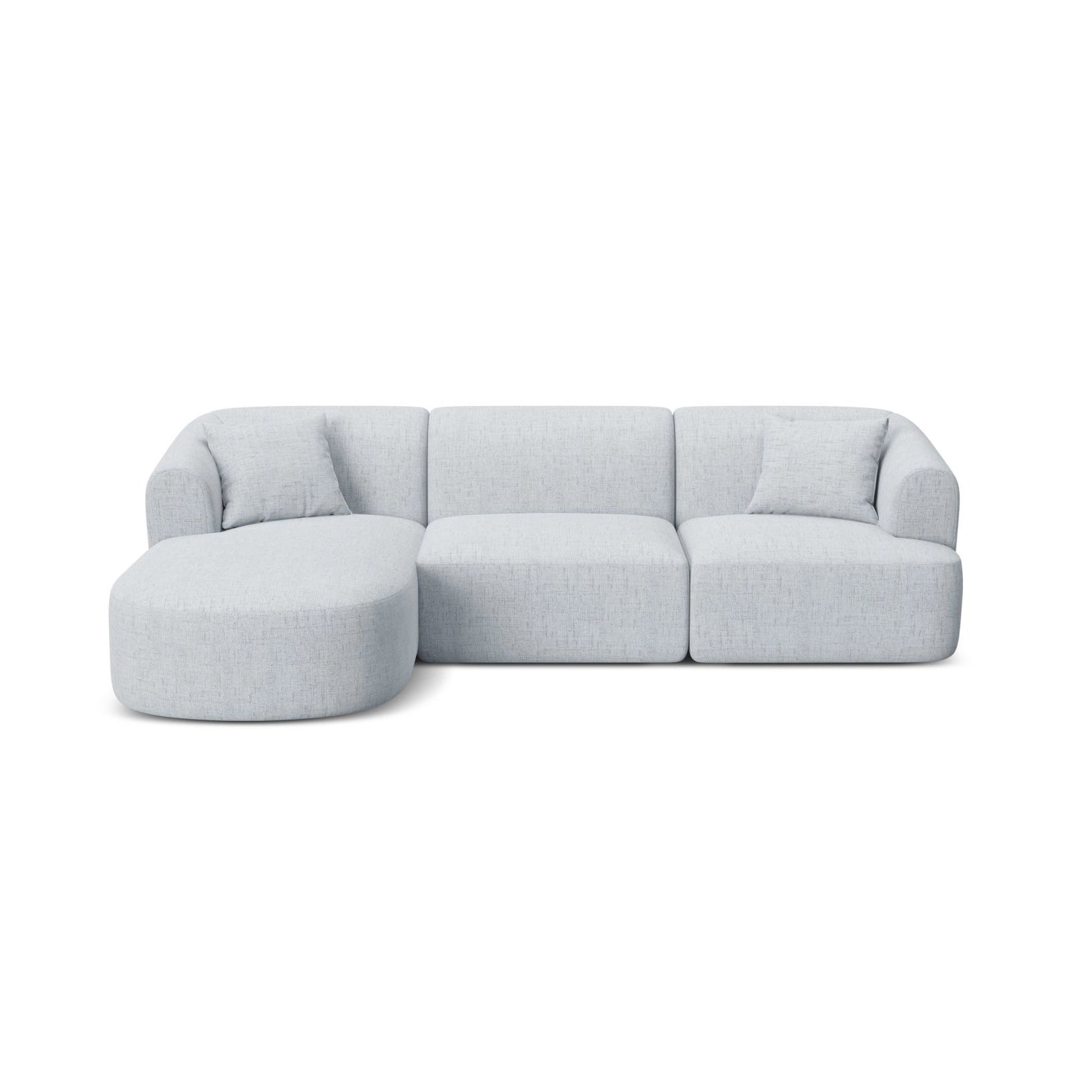 Le canapé d'angle Campi 4 places avec disposition à gauche est présenté dans un revêtement en velours beige clair de la collection de tissus Vogue 1 et offre une généreuse surface d'assise de 256 x 156 x 70 cm.