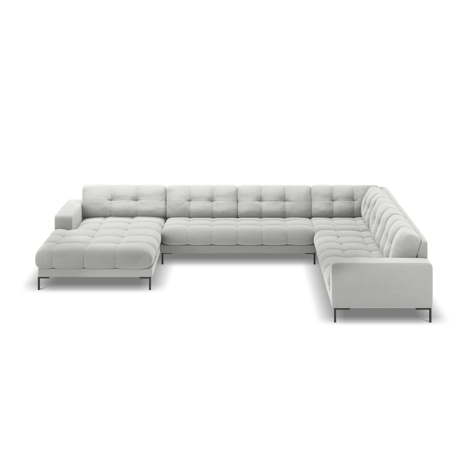 Canapé d'angle panoramique 7 places Mamaia, côté droit, pieds en métal noir, revêtement en velours ou tissu texturé, 327 x 256 cm - Tissu texturé (Nev02), beige clair est en rupture de stock et sera expédié dès qu’il sera de retour en stock.