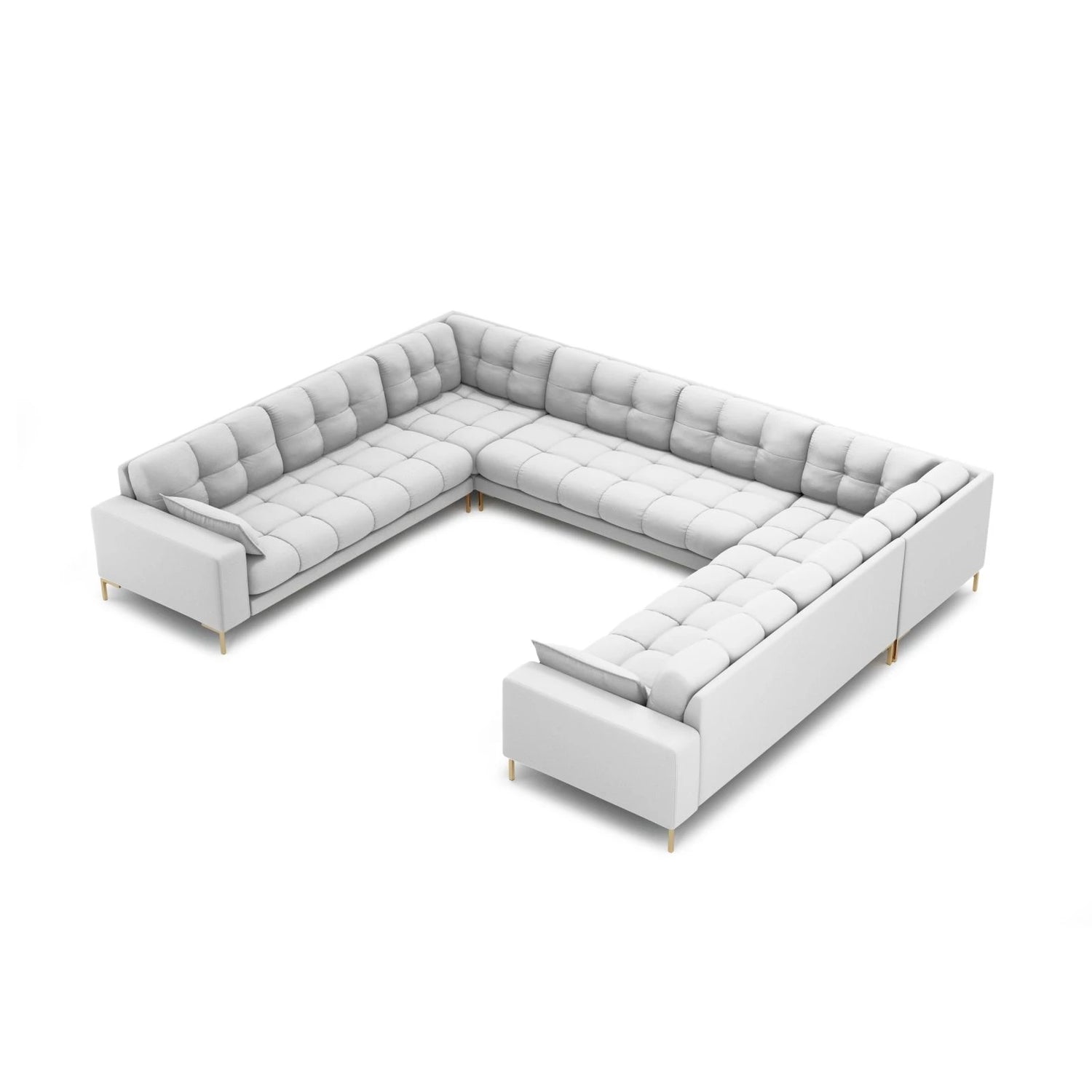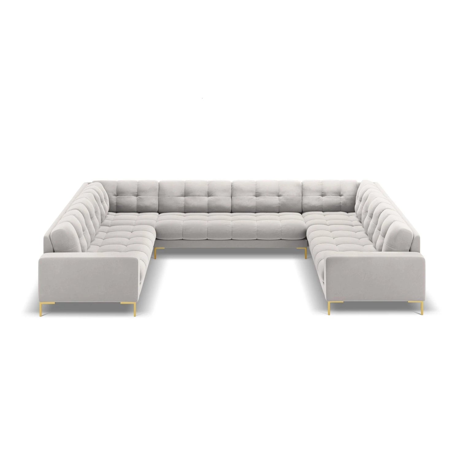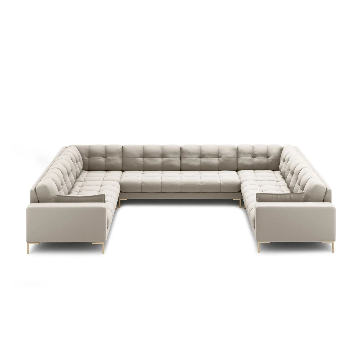 Mamaia 9-Sitzer Panorama-Sofa symmetrisch, Beine Goldmetall, mit Bezug aus Samt oder Strukturstoff, 337x256 cm - Strukturierter Stoff (Nev02), Leichtes Beige ist auf Lager und wird versandt, sobald es wieder verfügbar ist