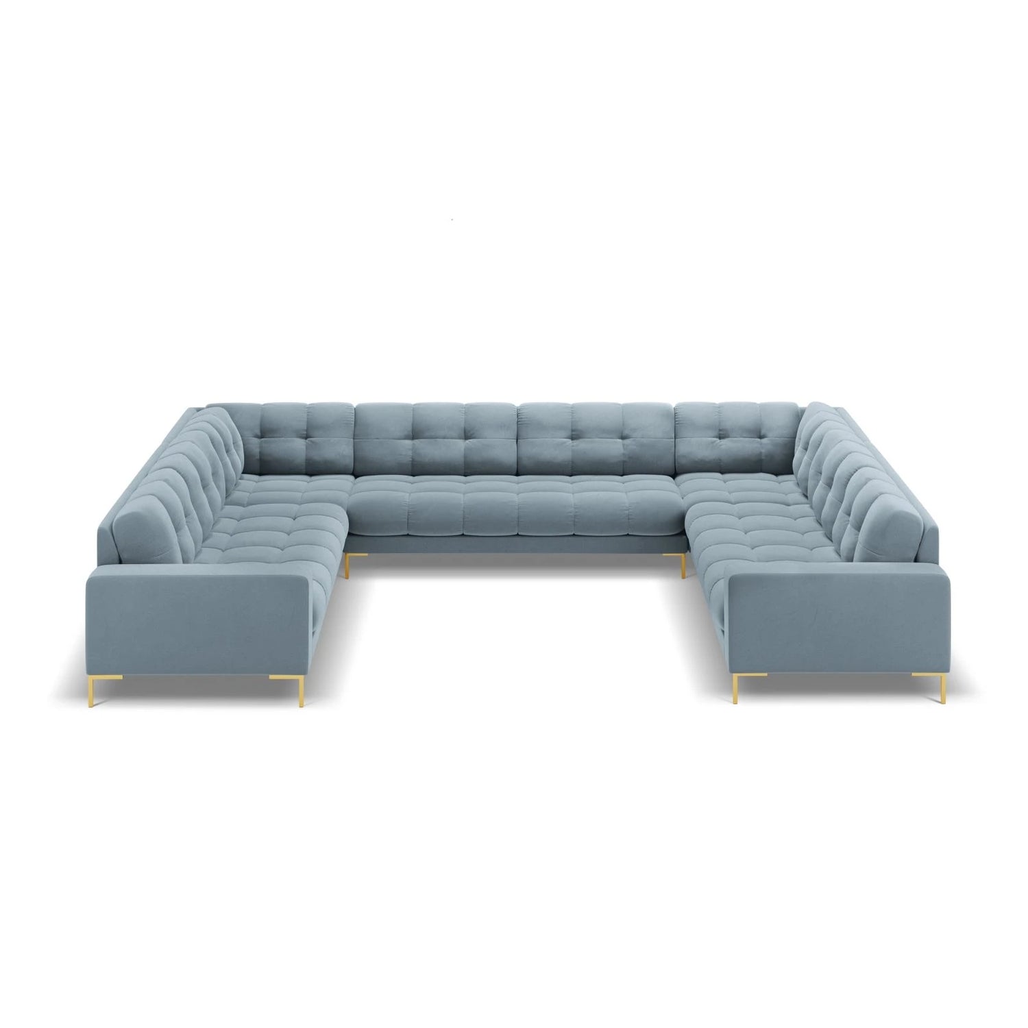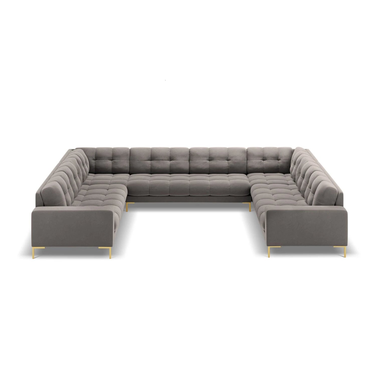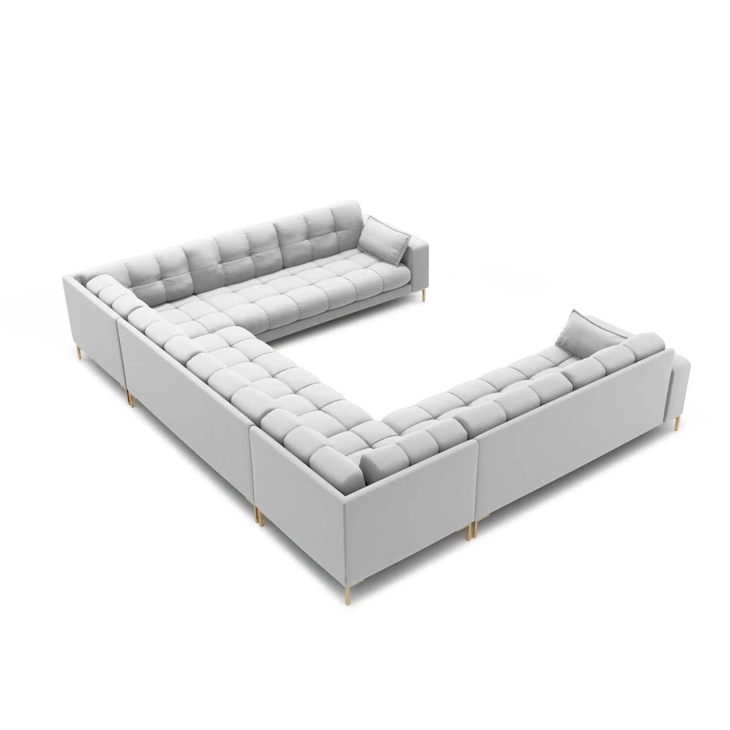 Mamaia 9-Sitzer Panorama-Sofa symmetrisch, Beine Goldmetall, mit Bezug aus Samt oder Strukturstoff, 337x256 cm - Strukturierter Stoff (Nev02), Leichtes Beige ist auf Lager und wird versandt, sobald es wieder verfügbar ist