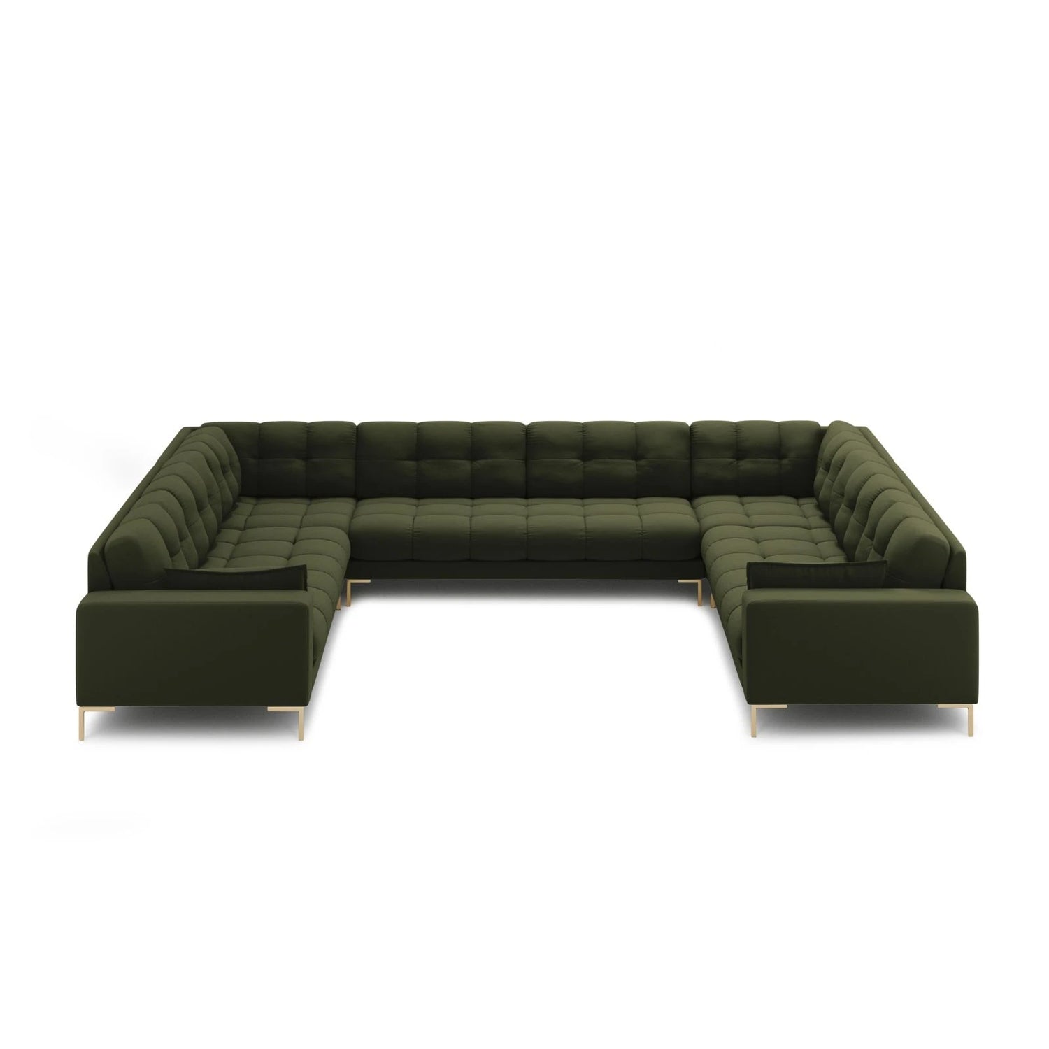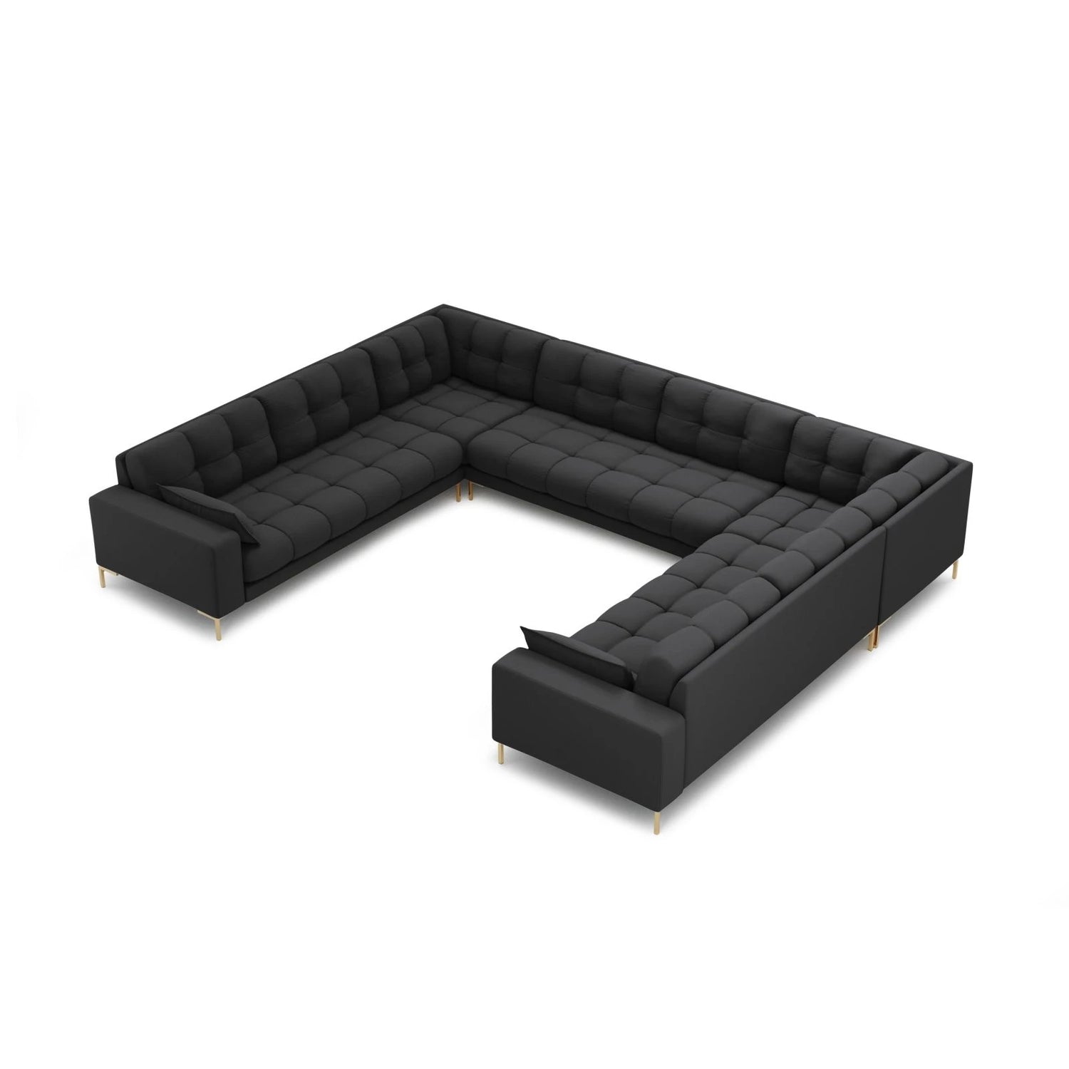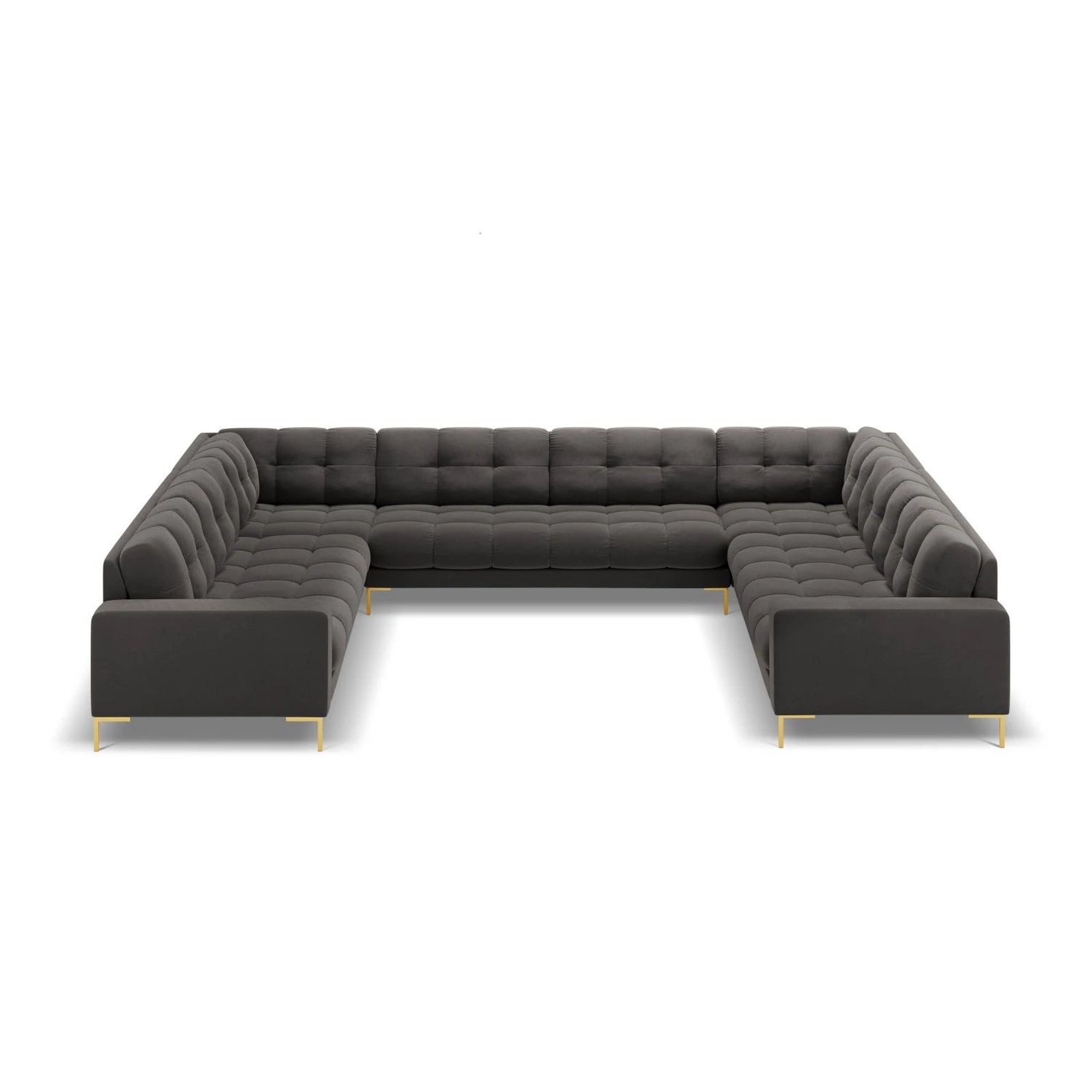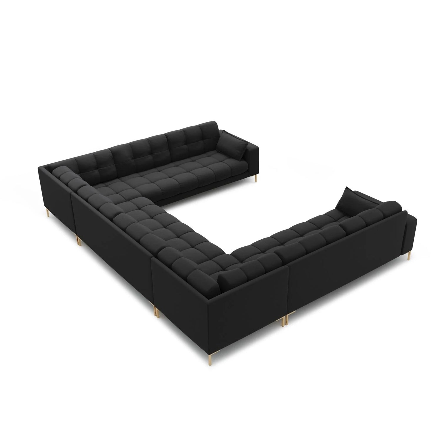 Entdecken Sie das 9-Sitzer Panorama-Sofa Mamaia von Micadoni, eine Fusion aus Eleganz, modernem Design und Komfort. Ihr perfekter Ort zum Entspannen und Zusammensein erwartet Sie. Das sorgfältig gesteppte Design des Sofas "Bubble" Panorama Mamaia macht es einzigartig, ausdrucksstark und füllt jeden Raum mit positiver Energie. Ein Blick genügt und man kann es kaum erwarten, es sich bequem zu machen oder, noch besser, Zeit darauf zu verbringen, um seinen Lieblingsfilm anzuschauen, zu lesen oder mit seinen Lieben zu plaudern. Die bequemen Rückenlehnen und Sitzflächen bieten einen unglaublichen Komfort. Die seitlichen Kissen mit dekorativen Abschlüssen setzen dekorative Akzente. Der luxuriöse Bezug aus weichem und strapazierfähigem Material in Verbindung mit den geometrischen Metallfüßen verkörpert Modernität und Eleganz für den täglichen Gebrauch. Das für 6 Personen ausgelegte Sofa Panorama Mamaia ist außergewöhnlich langlebig und robust. Es lässt sich perfekt mit anderen Elementen der Kollektion kombinieren.