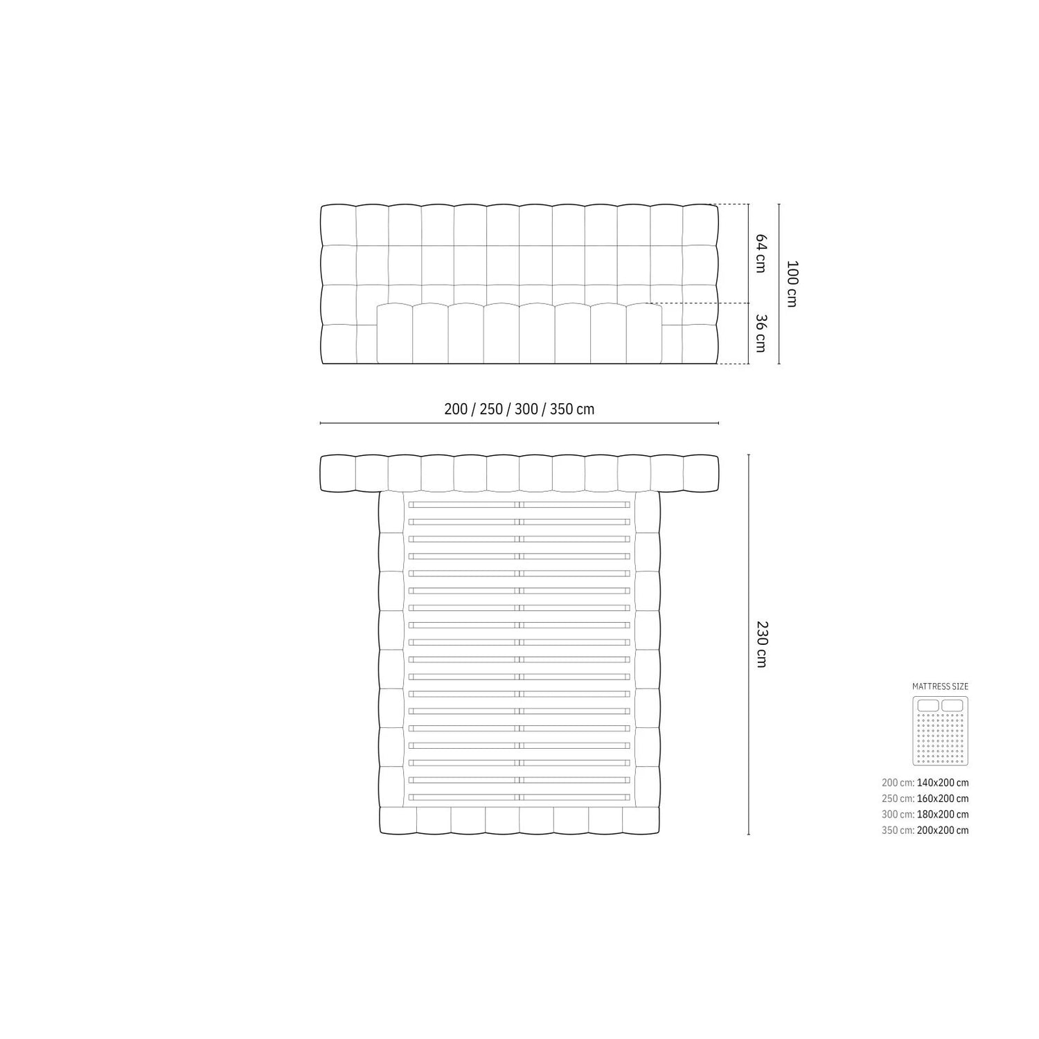 Ihr Schlafzimmer dekorieren? Sehen Sie sich das Bett Mamaia von Micadoni für Matratzen in der Grösse 180x200 cm an, es sorgt für einen erholsamen Schlaf und Stauraum. Die breite Kopfstütze garantiert Komfort. Die sorgfältige Steppung des Bezugs des Bubble Mamaia-Betts macht es zu einem außergewöhnlichen Möbelstück, das jedes Schlafzimmer mit positiver Energie füllt. Ein Blick auf das Bett macht Lust, sich hinzulegen und einen friedlichen Nachtschlaf zu genießen. Dank des weichen Kopfteils können Sie auch vor dem Einschlafen ein Buch lesen oder einen Film ansehen und morgens ein gemütliches Frühstück im Bett genießen. Das Kopfteil passt perfekt zur Größe und zum Steppmuster des Bettes und schafft so einen zusammenhängenden und eleganten Look. Der Bettrahmen bietet viel Platz zur Aufbewahrung von Bettwäsche und anderen Textilien. Der luxuriöse Bezug besteht aus weichem, strapazierfähigem Material, das Modernität und Eleganz ausstrahlt und sich perfekt für den täglichen Gebrauch eignet. Mit verschiedenen Bettbreiten können Sie es leicht an die Größe Ihres Schlafzimmers anpassen. Das Mamaia-Bett ist außerordentlich robust und solide und passt perfekt zu anderen Elementen des Zimmers, wie dem Hocker und dem Sessel. Kasten: Gaslift-Bettkasten mit Frontöffnung Je nach Größe des Produkts kann die Anzahl der Stiche auf dem Kopfteil variieren. Metallrahmen mit elastischen Lamellen