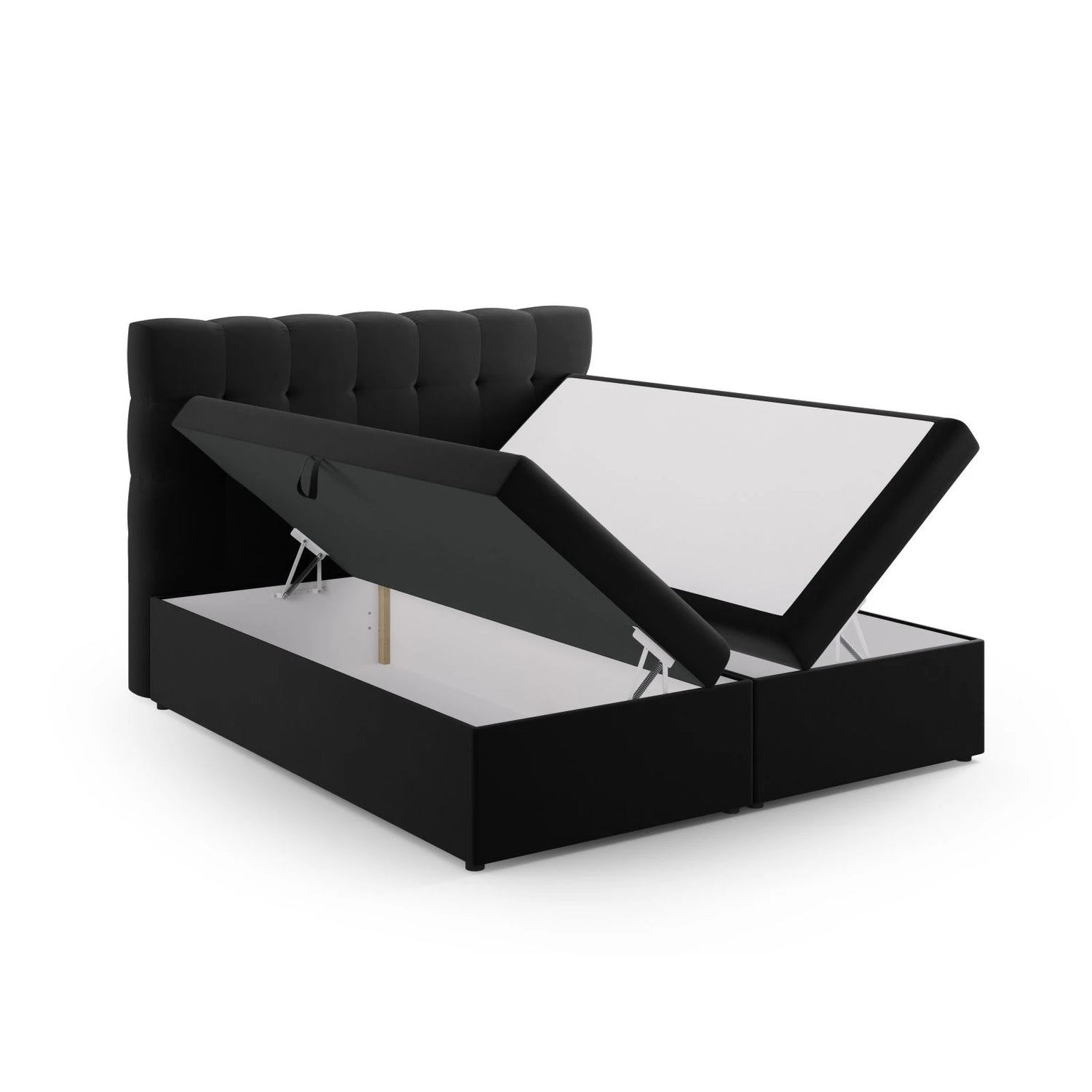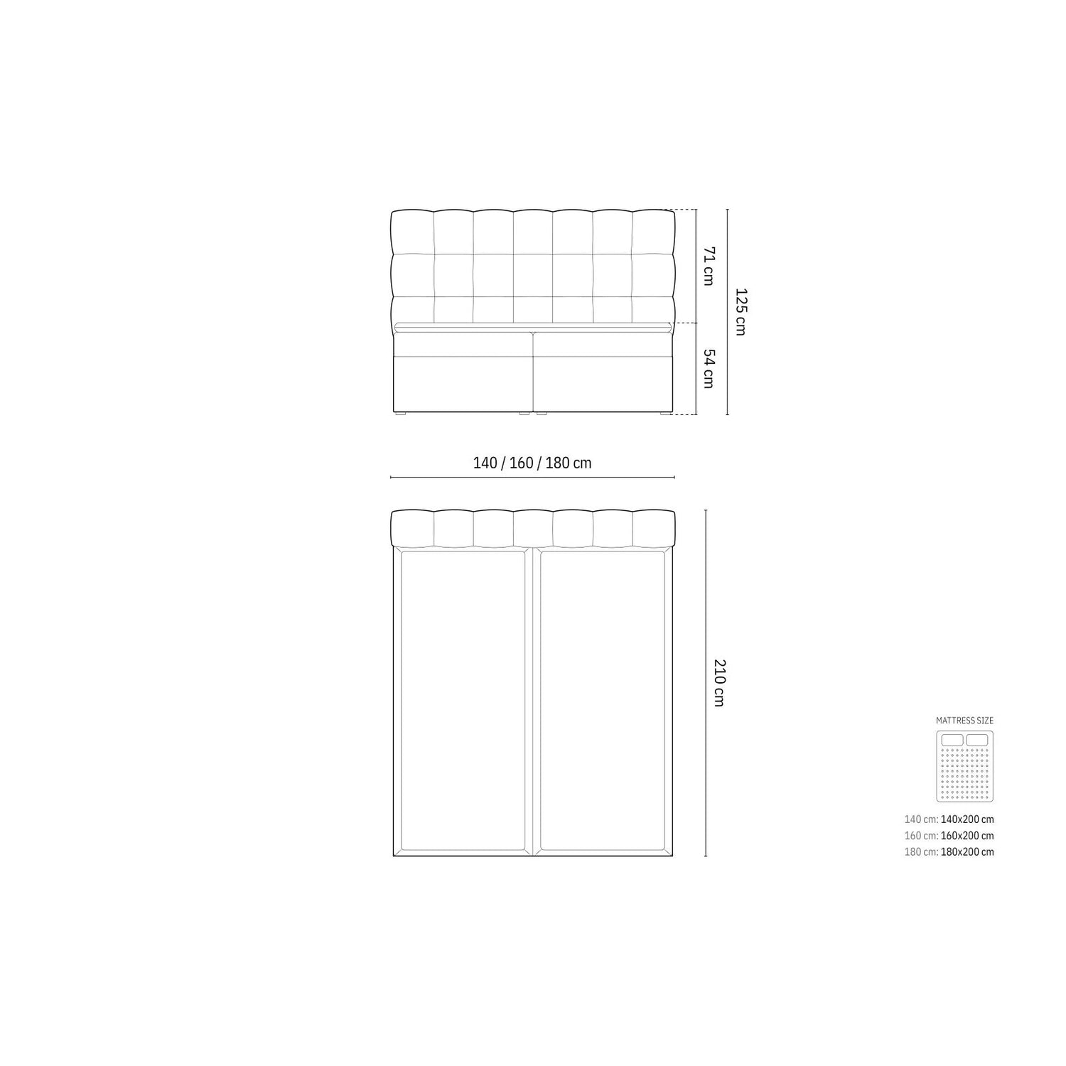 Entdecken Sie den Komfort und Stil des Mamaia Boxspringbettes von Micadoni, Liegefläche 160x200cm, das Eleganz mit Funktionalität verbindet. Es bietet die beste Schlafqualität in Schlafzimmer. Wenn Sie in Ihrem Schlafzimmer Wert auf Komfort legen, sollten Sie das kontinentale Mamaia-Bett in Betracht ziehen. Dieser Möbeltyp ist für seinen außergewöhnlichen Komfort und seine Unterstützung während des Schlafs bekannt. Es besteht aus einem robusten, gepolsterten Kasten, auf dem eine Taschenfederkernmatratze und eine dünnere Matratzenauflage (Topper) liegen. Schon beim ersten Anblick kann man es kaum erwarten, sich hinzulegen oder - noch besser - die ganze Nacht durchzuschlafen. Die hohe, elegante Silhouette verleiht dem Mamaia-Bett ein luxuriöses Aussehen im Schlafzimmer. Das sehr weiche Kopfteil mit der für die gesamte Kollektion charakteristischen dekorativen Steppung bietet bequemen Halt für Rücken und Schultern und ist gleichzeitig ein dekorativer Akzent im Raum. Das Bett Mamaia ist außergewöhnlich strapazierfähig und solide. Die angenehmen und strapazierfähigen Polstermaterialien sind für den täglichen Gebrauch geeignet. Der praktische Stauraum bietet Platz für Bettwäsche und andere Textilien. Der Bettkasten lässt sich von beiden Seiten öffnen, so dass der Inhalt leicht zugänglich ist. 4 cm dicker Topper aus Polyurethanschaum 25 kg/m³ Matratzenstärke 16 cm Kopfteil aus Polyurethanschaum 25 kg/m³