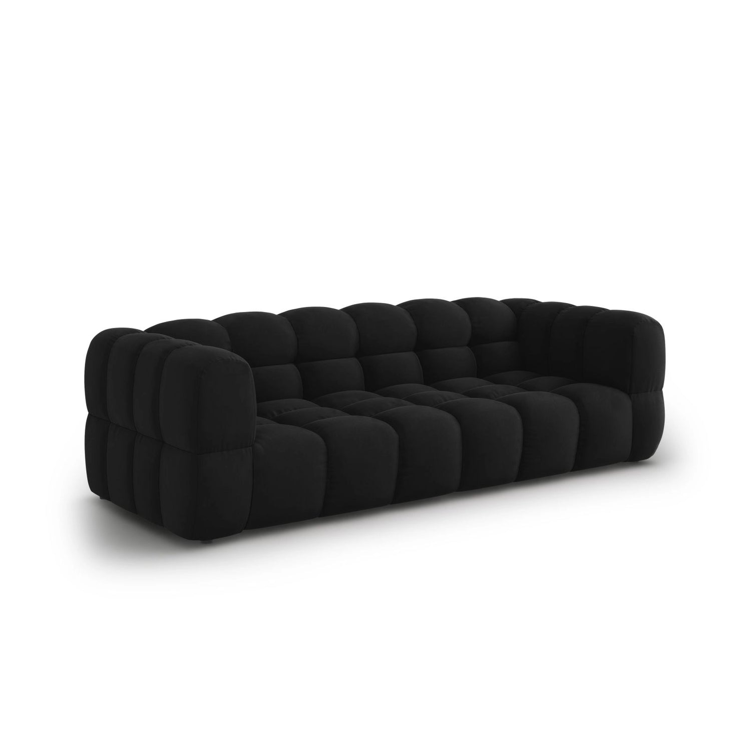 Der Bezug besteht aus hochwertigem, weichem Velours mit feinem Glanz und einer gleichmäßigen Oberfläche. Das Material ist besonders strapazierfähig, kratzfest sowie schmutz- und flüssigkeitsabweisend, was die Pflege erleichtert. Die Polsterung besteht aus Polyurethanschaum mit unterschiedlichen Dichten, der für angenehmen Sitzkomfort sorgt. Die stabile Konstruktion aus massivem Kiefernholz, Spanplatten und Sperrholz ist mit Federn ausgestattet und ruht auf schwarzen Kunststoffbeinen.